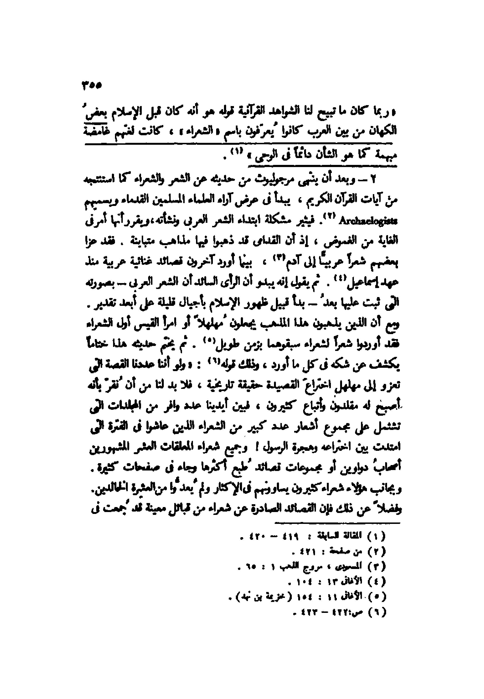 2- وبعد أن ينتهي مرجوليوث من حديثه عن الشعر والشعراء كما استنتجه من آيات القرآن الكريم، يبدأ في عرض آراء العلماء المسلمين القدماء ويسميهم2 Archaelogists. فيثير مشكلة ابتداء الشعر العربي ونشأته، ويقرر أنها أمر في الغاية من الغموض؛ إذ إن القدامى قد ذهبوا فيها مذاهب متباينة. فقد عزا بعضهم شعرًا عربيًّا إلى آدم3، بينما أورد آخرون قصائد غنائية عربية منذ عهد إسماعيل4. ثم يقول إنه يبدو أن الرأي السائد أن الشعر العربي -بصورته التي ثبت عليها بعدُ- بدأ قبيل ظهور الإسلام بأجيال قليلة على أبعد تقدير.