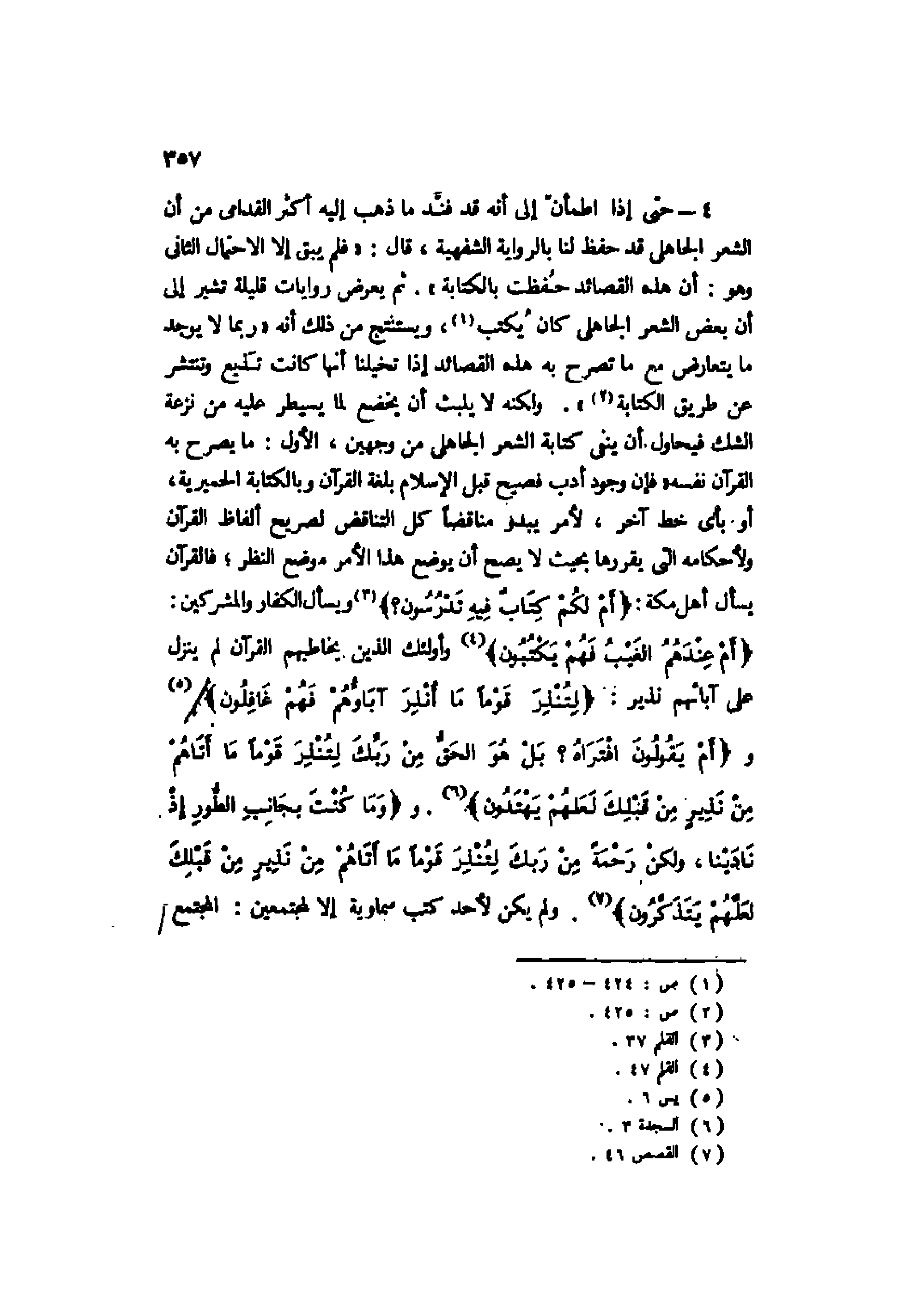 4- حتى إذا اطمأن إلى أنه قد فند ما ذهب إليه أكثر القدامى من أن الشعر الجاهلي قد حفظ لنا بالرواية الشفهية، قال: "فلم يبق إلا الاحتمال الثاني وهو: أن هذه القصائد حُفظت بالكتابة". ثم يعرض راويات قليلة تشير إلى أن بعض الشعر الجاهلي كان يُكتب1، ويستنتج من ذلك أنه "ربما لا يوجد ما يتعارض مع ما تصرح به هذه القصائد إذا تخيلنا أنها كانت تذيع وتنتشر عن طريق الكتابة2". ولكنه لا يلبث أن يخضع لما يسيطر عيه من نزعة الشك فيحاول أن ينفي كتابة الشعر الجاهلي من وجهين، الأول: ما يصرح به القرآن نفسه "فإن وجود أدب فصيح قبل الإسلام بلغة القرآن وبالكتابة الحميرية، أو بأي خط آخر، لأمر يبدو مناقضًا كل التناقض لصريح ألفاظ القرآن ولأحكامه التي يقررها بحيث لا يصح أن يوضع هذا الأمر موضع النظر؛ فالقرآن يسأل أهل مكة: {أَمْ لَكُمْ كِتَابٌ فِيهِ تَدْرُسُون} 3 ويسأل الكفار والمشركين: {أَمْ عِنْدَهُمْ الْغَيْبُ فَهُمْ يَكْتُبُونَ} 4 وأولئك الذي يخاطبهم القرآن لم ينزل على آبائهم نذير: {لِتُنذِرَ قَوْمًا مَا أُنذِرَ آبَاؤُهُمْ فَهُمْ غَافِلُونَ} 5. و {أَمْ يَقُولُونَ افْتَرَاهُ بَلْ هُوَ الْحَقُّ مِنْ رَبِّكَ لِتُنذِرَ قَوْمًا مَا أَتَاهُمْ مِنْ نَذِيرٍ مِنْ قَبْلِكَ لَعَلَّهُمْ يَهْتَدُونَ} 6. {وَمَا كُنتَ بِجَانِبِ الطُّورِ إِذْ نَادَيْنَا وَلَكِنْ رَحْمَةً مِنْ رَبِّكَ لِتُنذِرَ قَوْمًا مَا أَتَاهُمْ مِنْ نَذِيرٍ مِنْ قَبْلِكَ لَعَلَّهُمْ يَتَذَكَّرُونَ} 7. ولم يكن لأحد كتب سماوية إلا لمجتمعين: المجتمع