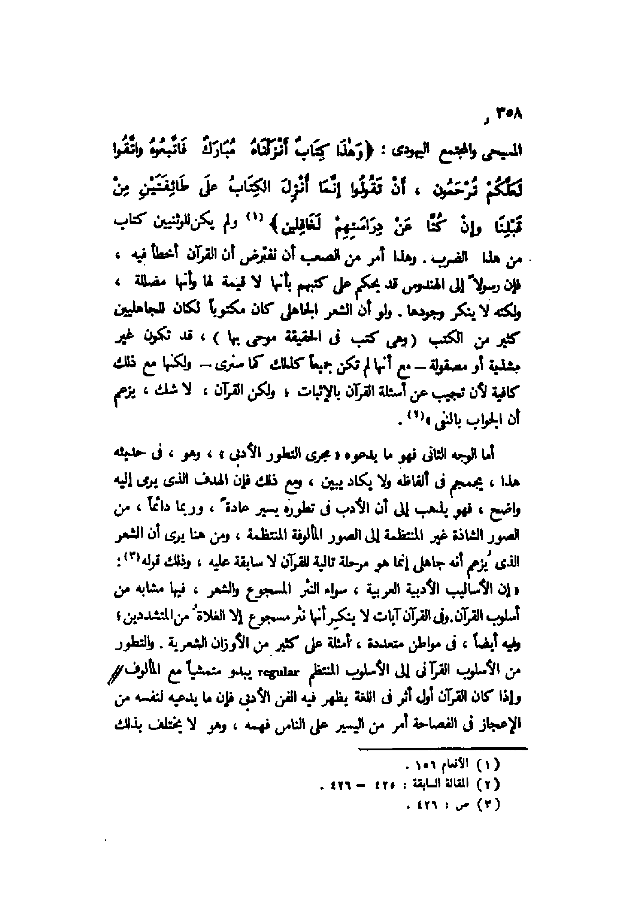 المسيحي والمجتمع اليهودي: {وَهَذَا كِتَابٌ أَنزَلْنَاهُ مُبَارَكٌ فَاتَّبِعُوهُ وَاتَّقُوا لَعَلَّكُمْ تُرْحَمُونَ، أَنْ تَقُولُوا إِنَّمَا أُنزِلَ الْكِتَابُ عَلَى طَائِفَتَيْنِ مِنْ قَبْلِنَا وَإِنْ كُنَّا عَنْ دِرَاسَتِهِمْ لَغَافِلِينَ} 1 ولم يكن للوثنيين كتاب من هذا الضرب. وهذا أمر من الصعب أن نفترض أن القرآن أخطأ فيه، فإن رسولًا إلى الهندوس قد يحكم على كتبهم بأنها لا قيمة لها وأنها مضللة، ولكنه لا ينكر وجودها. ولو أن الشعر الجاهلي كان مكتوبًا لكان للجاهليين كثير من الكتب "وهي كتب في الحقيقة موحى بها"، قد تكون غير مشذبة أو مصقولة -مع أنها لم تكن جميعًا كذلك كما سنرى- ولكنها مع ذلك كافية لأن تجيب عن أسئلة القرآن بالإثبات؛ ولكن القرآن، لا شك، يزعم أن الجواب بالنفي2".