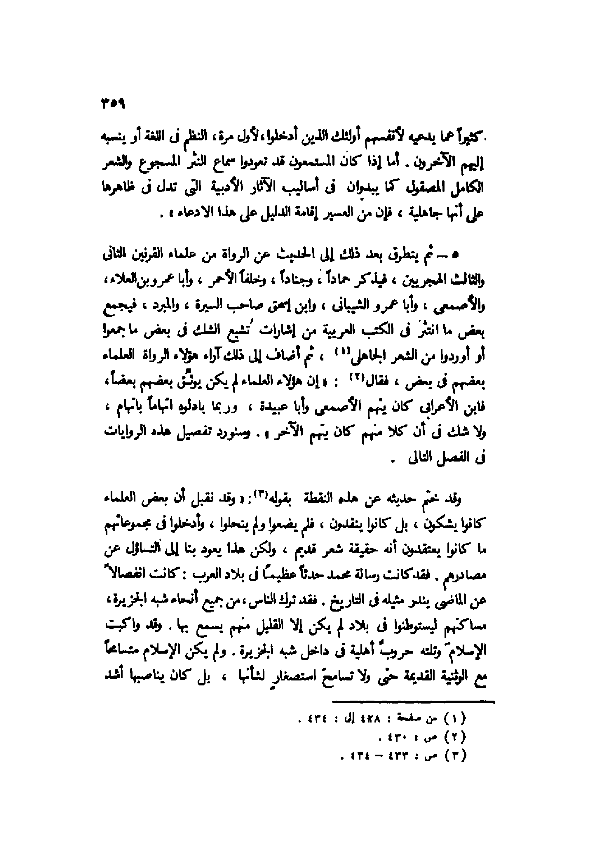 5- ثم يتطرق بعد ذلك إلى الحديث عن الرواة من علماء القرنين الثاني والثالث الهجريين، فيذكر حمادًا، وجنادًا، وخلفًا الأحمر، وأبا عمرو بن العلاء، والأصمعي، وأبا عمرو الشيباني، وابن إسحاق صاحب السيرة، والمبرد، فيجمع بعض ما انتثر في الكتب العربية من إشارات تُشيع الشك في بعض ما جمعوا أو أوردوا من الشعر الجاهلي1، ثم أضاف إلى ذلك آراء هؤلاء الرواة العلماء بعضهم في بعض، فقال2: "إن هؤلاء العلماء لم يكن يوثق بعضهم بعضًا، فابن الأعرابي كان يتهم الأصمعي وأبا عبيدة، وربما بادلوه اتهامًا باتهام، ولا شك في أن كلًّا منهم كان يتهم الآخر". وسنورد تفصيل هذه الروايات في الفصل التالي.