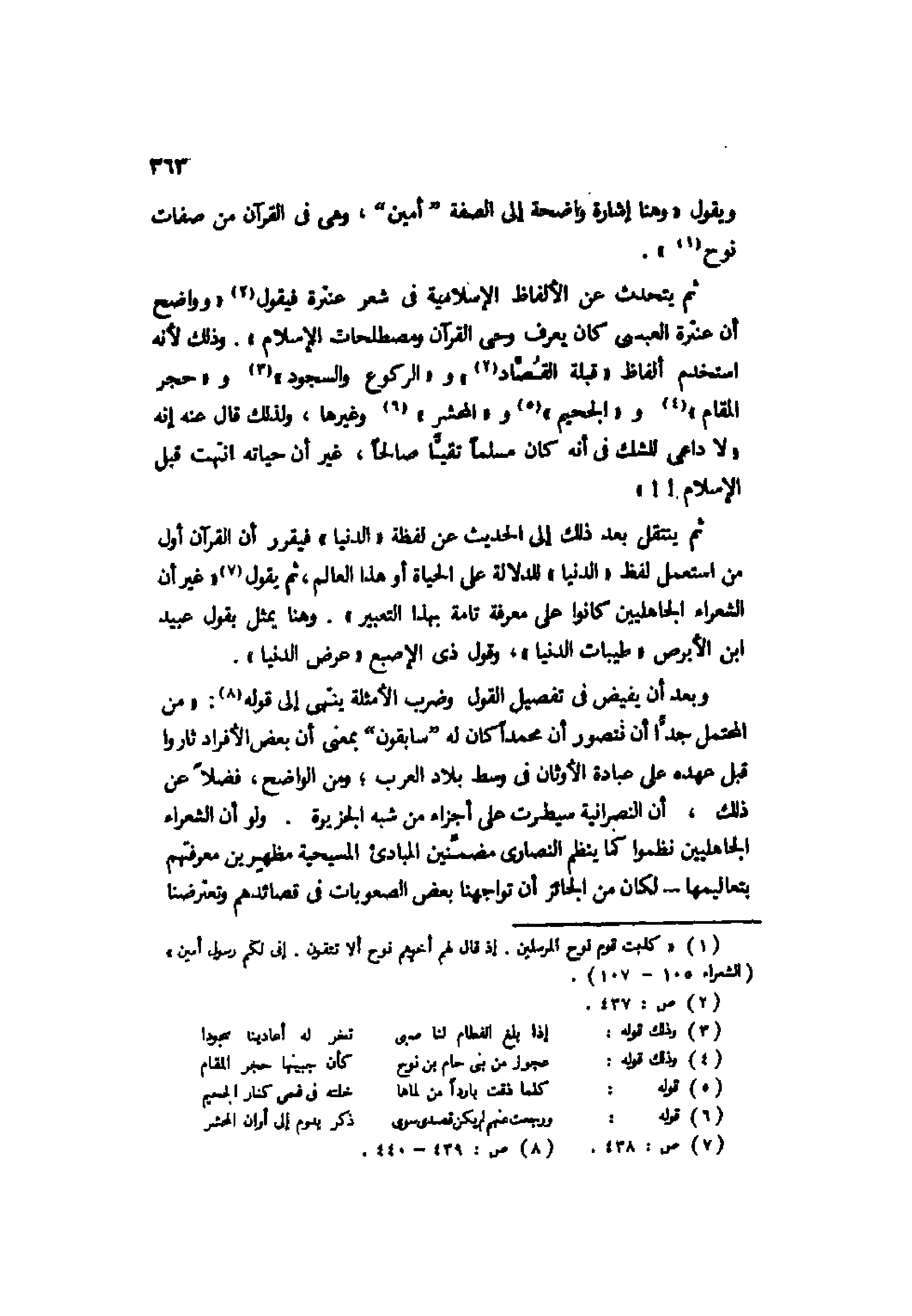 ثم يتحدث عن الألفاظ الإسلامية في شعر عنترة فيقول2: "وواضح أن عنترة العبسي كان يعرف وحي القرآن ومصطلحات الإسلام". وذلك لأنه استخدم ألفاظ "قبلة القصاد"2 والركوع والسجود"3 و"حجر المقام"4 و"الجحيم"5 و"المحشر"6 وغيرها، ولذلك قال عنه إنه "لا داعي للشك في أنه كان مسلمًا تقيًّا صالحًا، غير أن حياته انتهت قبل الإسلام!! ".