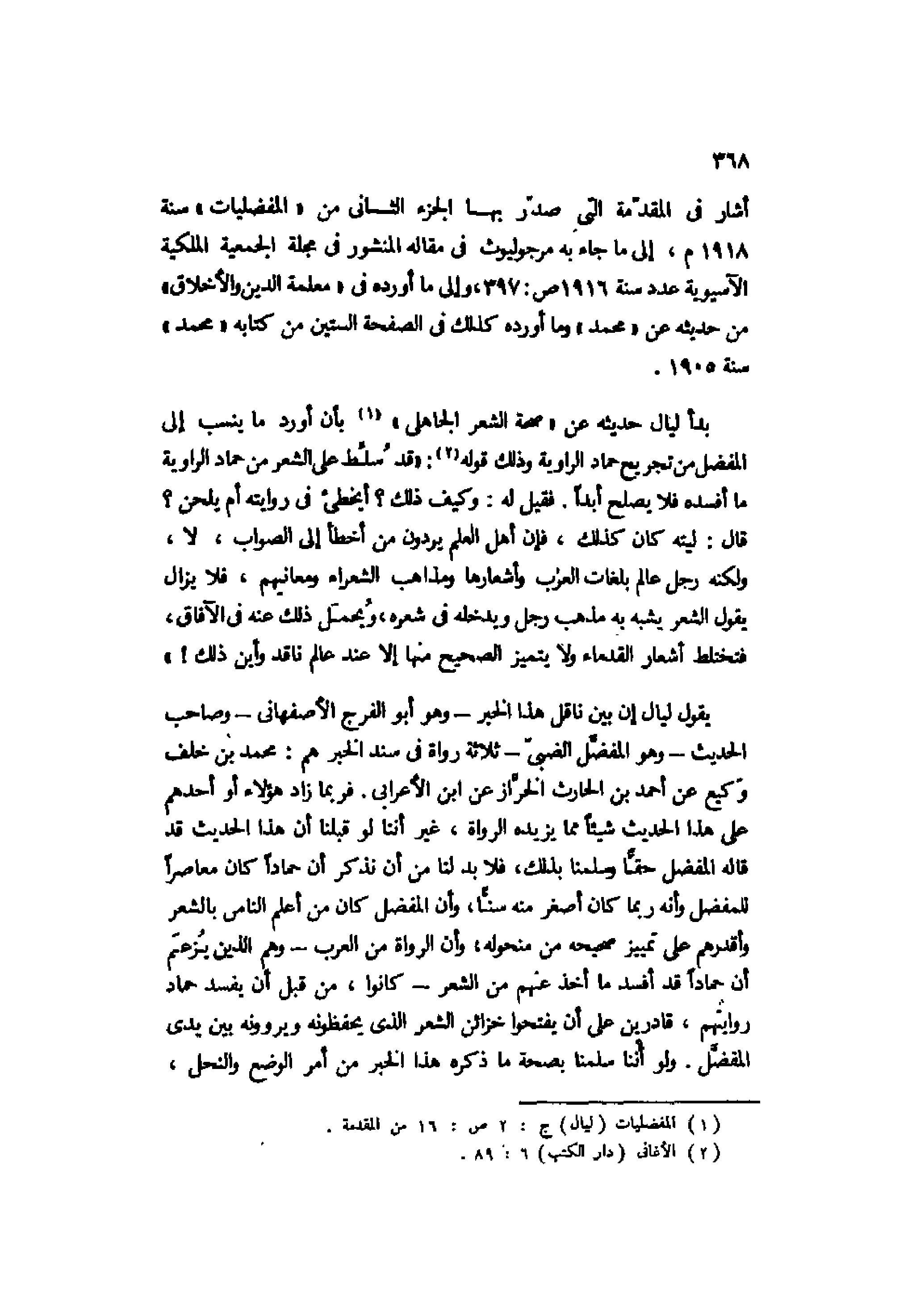 أشار في المقدمة التي صدر بها الجزء الثاني من "المفضليات" سنة 1918م، إلى ما جاء به مرجوليوث في مقاله المنشور في مجلة الجمعية الملكية الآسيوية عدد سنة 1916 ص397، وإلى ما أورده في "معلمة الدين والأخلاق" من حديثه عن "محمد" وما أورده كذلك في الصفحة الستين من كتابه "محمد" سنة 1905.