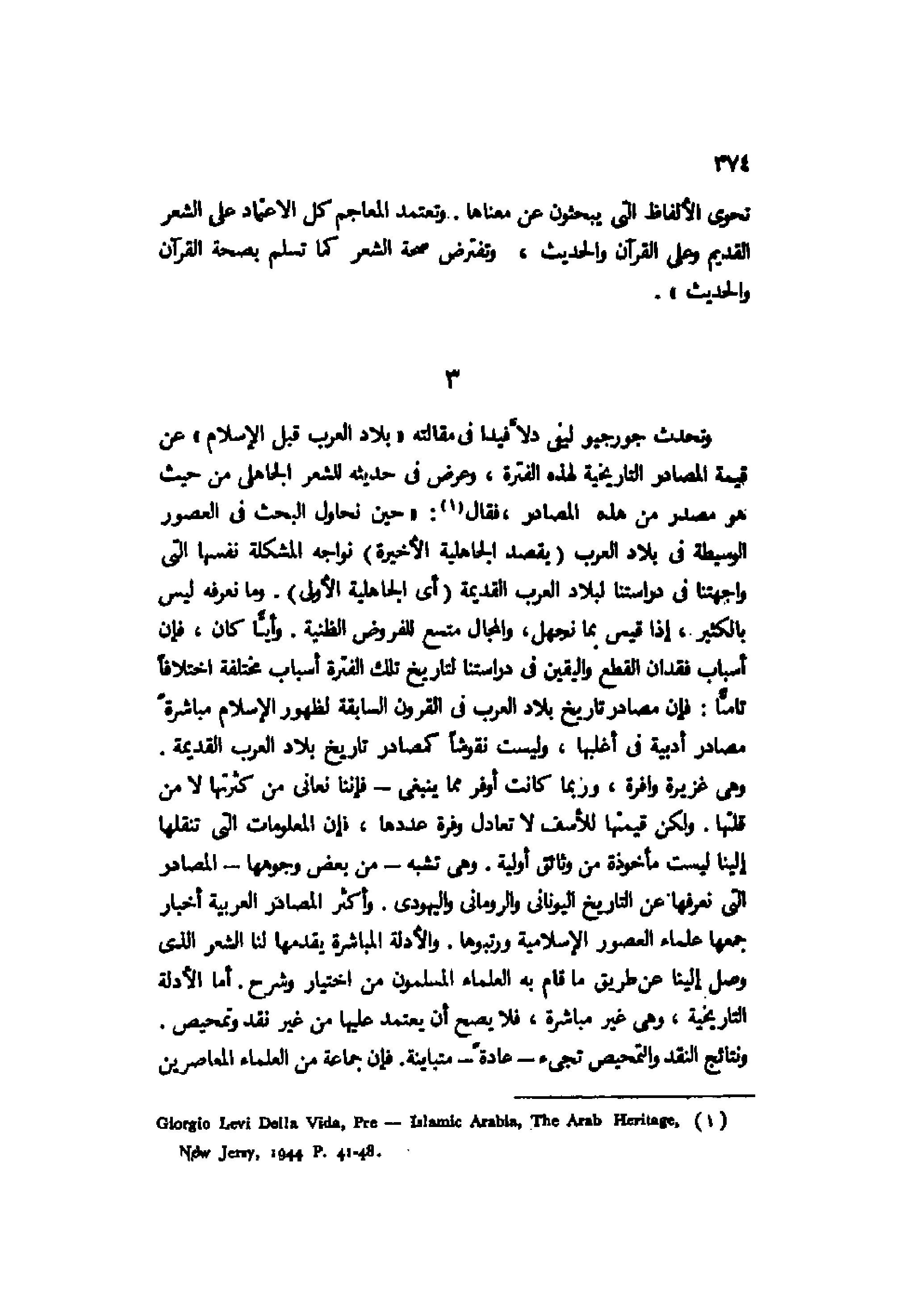 وتحدث جورجيو ليفي دلا فيدا في مقالته "بلاد العرب قبل الإسلام" عن قيمة المصادر التاريخية لهذه الفترة، وعرض في حديثه للشعر الجاهلي من حيث هو مصدر من هذه المصادر، فقال1: "حين نحاول البحث في العصور الوسيطة في بلاد العرب "يقصد الجاهلية الأخيرة" نواجه المشكلة نفسها التي واجهتنا في دراستنا لبلاد العرب القديمة "أي الجاهلية الأولى". وما نعرفه ليس بالكثير، إذا قيس بما نجهل، والمجال متسع للفروض الظنية. وأيًّا كان، فإن أسباب فقدان القطع واليقين في دراستنا لتاريخ تلك الفترة أسباب مختلفة اختلافًا تامًّا: فإن مصادر تاريخ بلاد العرب في القرون السابقة لظهور الإسلام مباشرةً مصادر أدبية في أغلبها، وليست نقوشًا كمصادر تاريخ بلاد العرب القديمة. وهي غزيرة وافرة، وربما كانت أوفر مما ينبغي فإننا نعاني من كثرتها لا من قلتها. ولكن قيمتها للأسف لا تعادل وفرة عددها، فإن المعلومات التي تنقلها إلينا ليست مأخوذة من وثائق أولية. وهي تشبه -من بعض وجوهها- المصادر التي نعرفها عن التاريخ اليوناني والروماني واليهودي. وأكثر المصادر العربية أخبار جمعها علماء العصور الإسلامية ورتبوها. والأدلة المباشرة يقدمها لنا الشعر الذي وصل إلينا عن طريق ما قام به العلماء المسلمون من اختيار وشرح. أما الأدلة التاريخية، وهي غير مباشرة، فلا يصح أن يعتمد عليها من غير نقد وتمحيص.