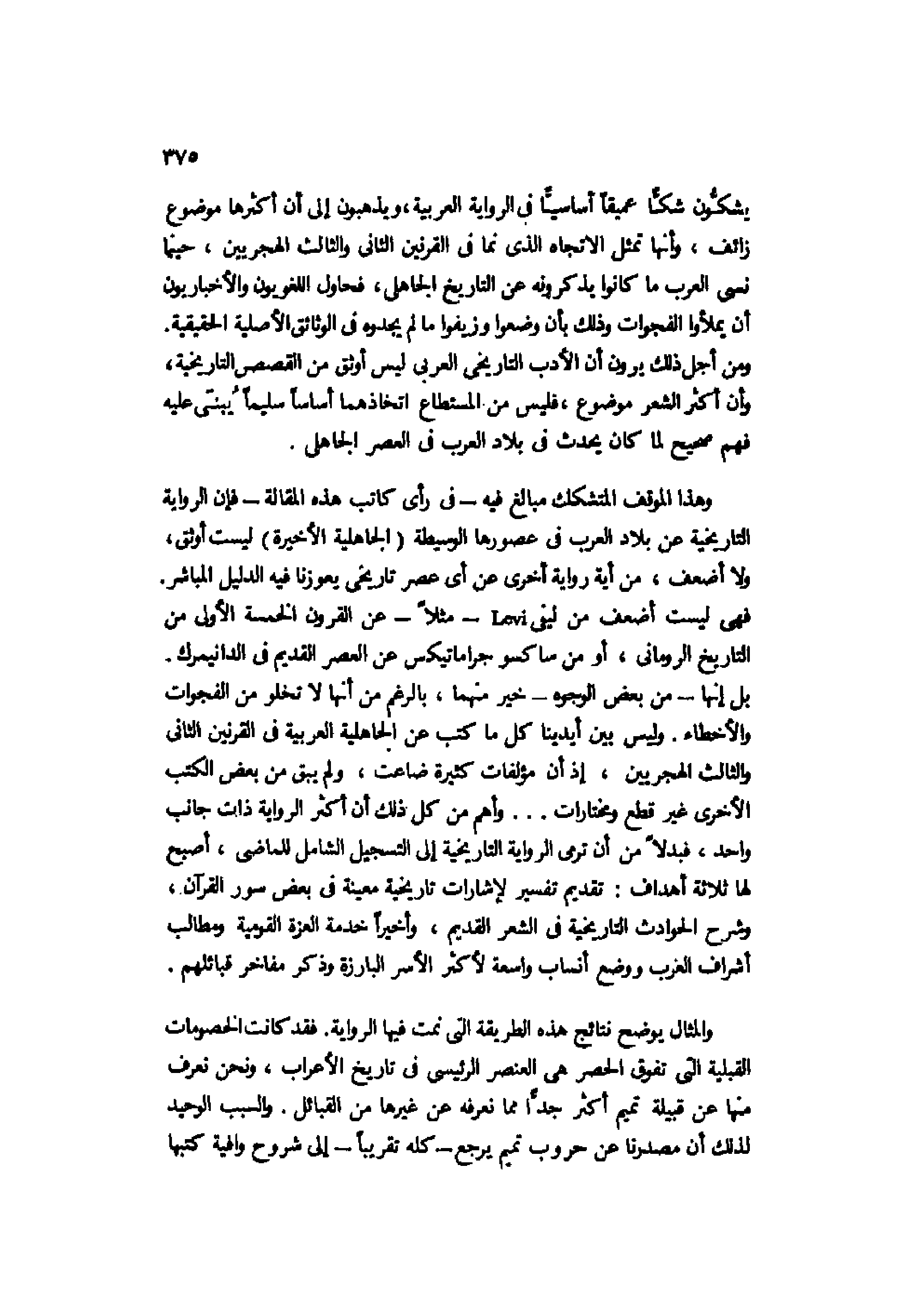 وهذا الموقف المتشكك مبالغ فيه -في رأي كاتب هذه المقالة- فإن الرواية التاريخية عن بلاد العرب في عصورها الوسيطة "الجاهلية الأخيرة" ليست أوثق، ولا أضعف، من أية رواية أخرى عن أي عصر تاريخي يعوزنا فيه الدليل المباشر.