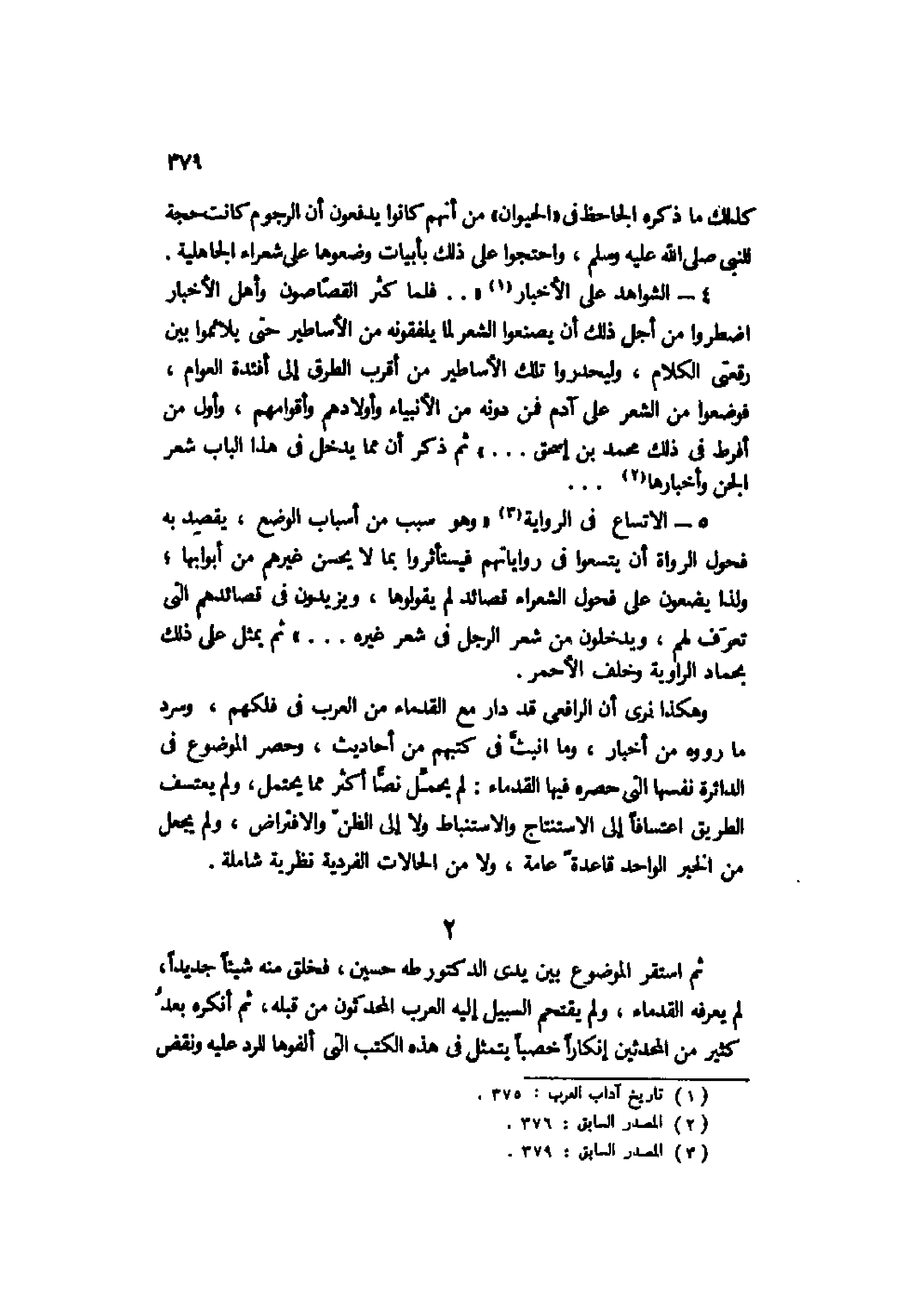 ثم استقر الموضوع بين يدي الدكتور طه حسين، فخلق منه شيئًا جديدًا، لم يعرفه القدماء، ولم يقتحم السبيل إليه العرب المحدثون من قبله، ثم أنكره بعدُ كثير من المحدثين إنكارًا خصبًا يتمثل في هذه الكتب التي ألفوها للرد عليه ونقض