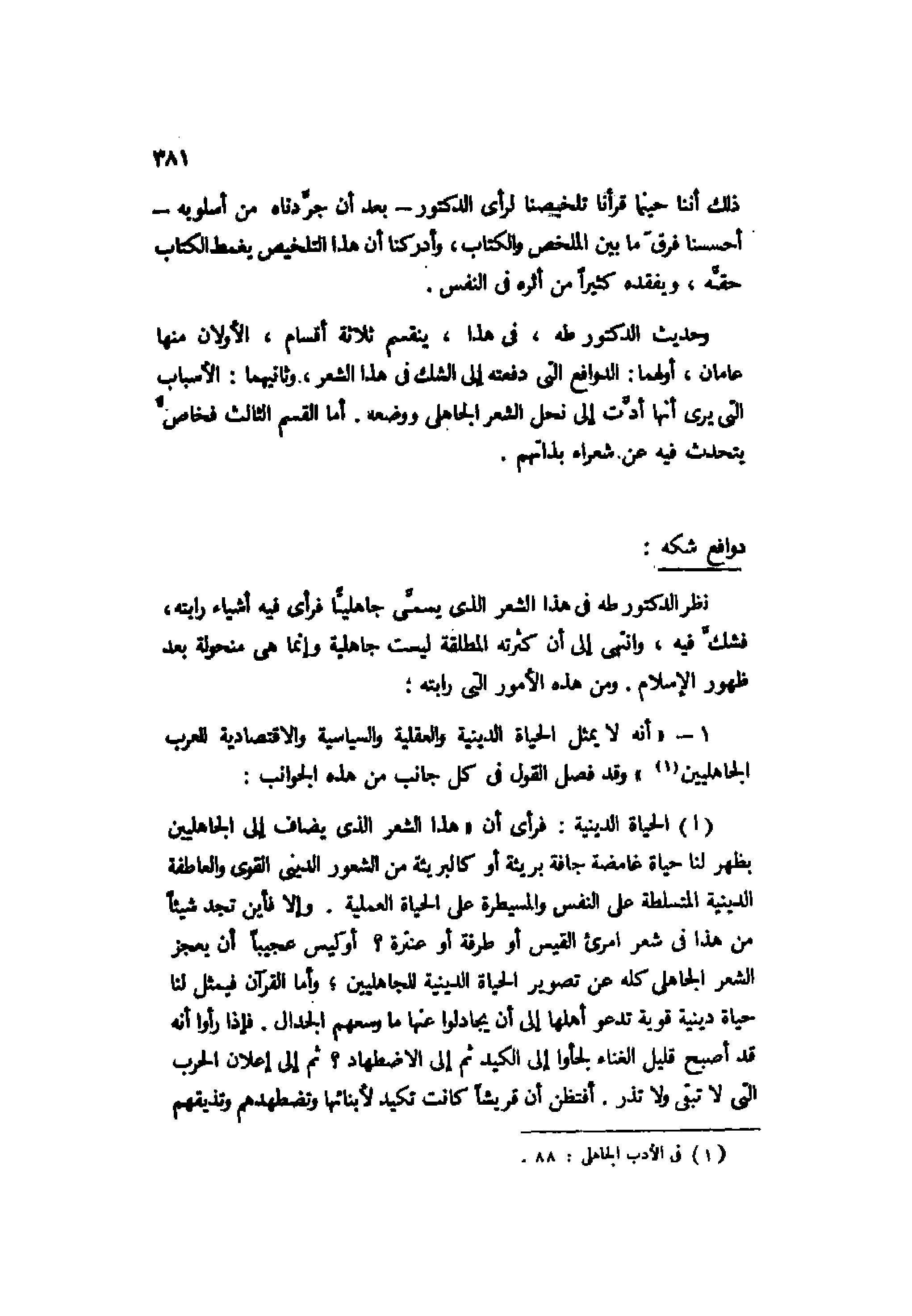 وحديث الدكتور طه، في هذا، ينقسم ثلاثة أقسام، الأولان منها عامان، أولهما: الدوافع التي دفعته إلى الشك في هذا الشعر، وثانيهما: الأسباب التي يرى أنها أدت إلى نحل الشعر الجاهلي ووضعه. أما القسم الثالث فخاصٌّ يتحدث فيه عن شعراء بذاتهم.