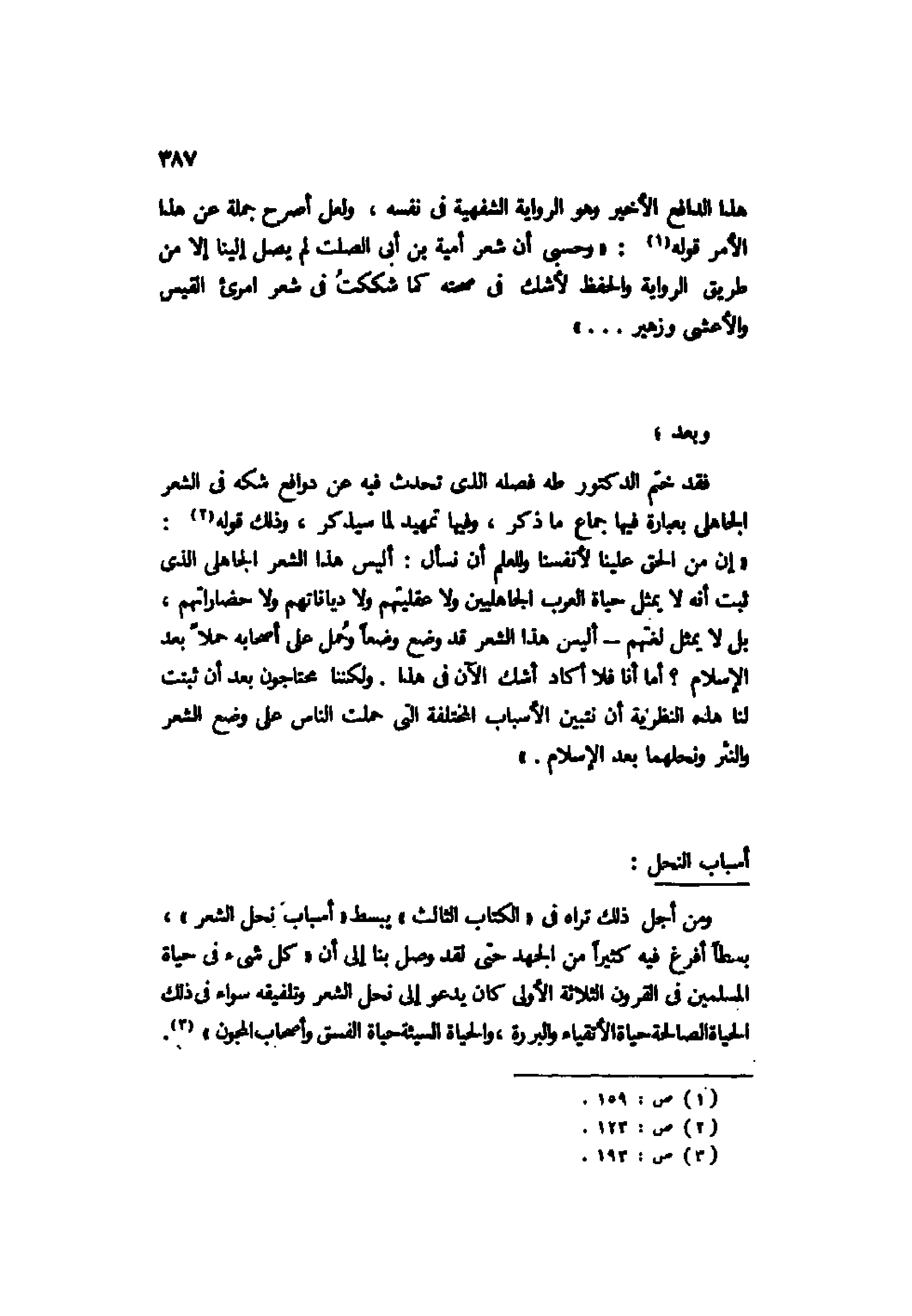 ومن أجل ذلك تراه في "الكتاب الثالث" يبسط "أسباب نحل الشعر"، بسطًا أفرغ فيه كثيرًا من الجهد حتى لقد وصل بنا إلى أن "كل شيء في حياة المسلمين في القرون الثلاثة الأولى كان يدعو إلى نحل الشعر وتلفيقه سواء في ذلك الحياة الصالحة حياة الأتقياء والبررة، والحياة السيئة حياة الفسق وأصحاب المجون"3.