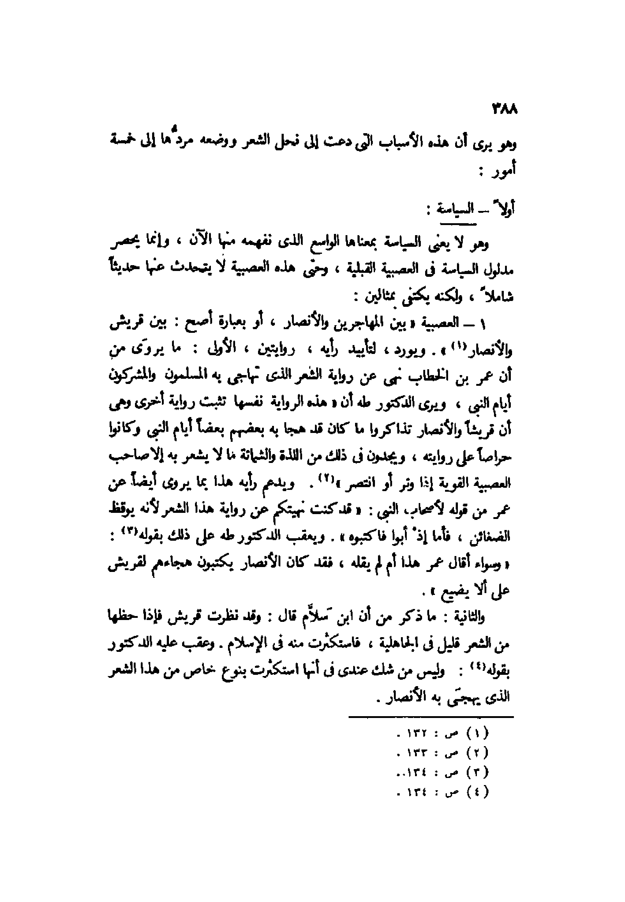 1- العصبية "بين المهاجرين والأنصار، أو بعبارة أصح: بين قريش والأنصار1". ويورد، لتأييد رأيه، روايتين، الأولى: ما يُروَى من أن عمر بن الخطاب نهى عن رواية الشعر الذي تهاجي به المسلمون والمشركون أيام النبي، ويرى الدكتور طه أن "هذه الرواية نفسها تثبت رواية أخرى وهي أن قريشًا والأنصار تذاكروا ما كان قد هجا به بعضهم بعضًا أيام النبي وكانوا حراصًا على روايته، ويجدون في ذلك من اللذة والشماتة ما لا يشعر به إلا صاحب العصبية القوية إذا وتر أو انتصر"2. ويدعم رأيه هذا بما يُروى أيضًا عن عمر من قوله لأصحاب النبي: "قد كنت نهيتكم عن رواية هذا الشعر لأنه يوقظ الضغائن، فأما إذ أبوا فاكتبوه". ويعقب الدكتور طه على ذلك بقوله3: