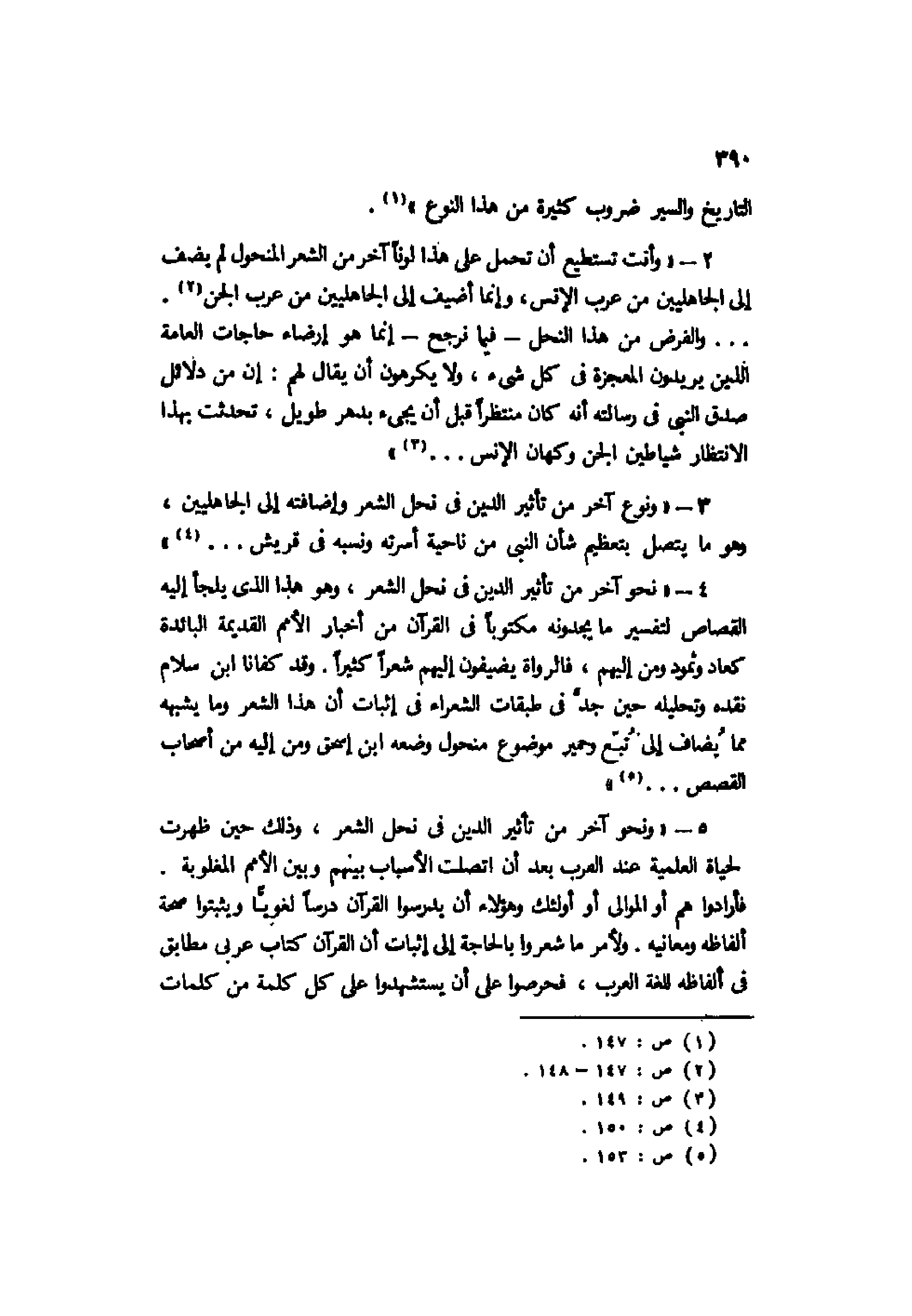 3- "ونوع آخر من تأثير الدين في نحل الشعر وإضافته إلى الجاهليين، وهو ما يتصل بتعظيم شأن النبي من ناحية أسرته ونسبه في قريش ... 4".