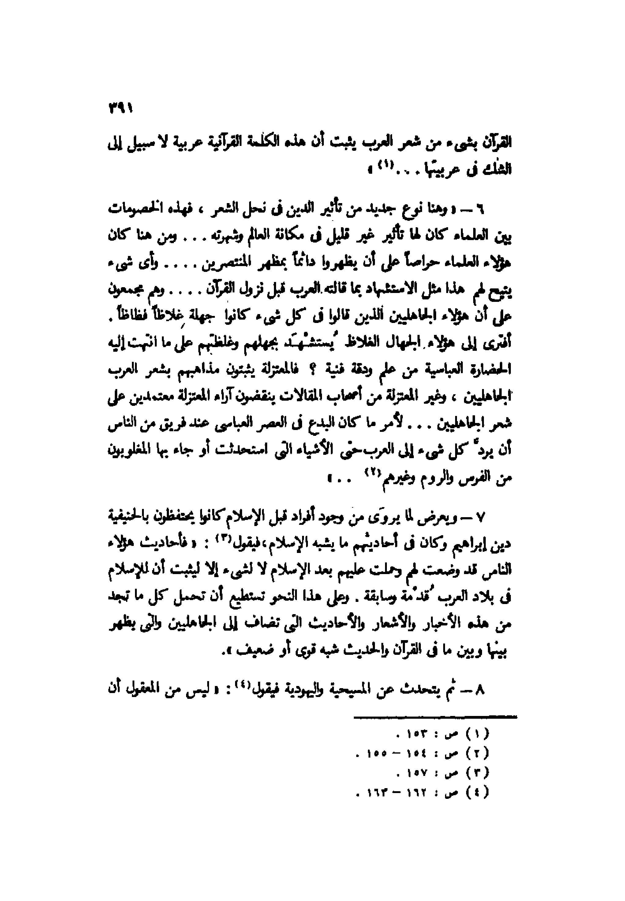 6- "وهنا نوع جديد من تأثير الدين في نحل الشعر، فهذه الخصومات بين العلماء كان لها تأثير غير قليل في مكانة العالم وشهرته ... ومن هنا كان هؤلاء العلماء حراصًا على أن يظهروا دائمًا بمظهر المنتصرين ... وأي شيء يتيح لهم هذا مثل الاستشهاد بما قالته العرب قبل نزول القرآن ... وهم مجمعون على أن هؤلاء الجاهليين الذين قالوا في كل شيء كانوا جهلة غلاظًا فظاظًا أفترى إلى هؤلاء الجهال الغلاظ يُستشهد بجهلهم وغلظتهم على ما انتهت إليه الحضارة العباسية من علم ودقة فنية؟ فالمعتزلة يثبتون مذاهبهم بشعر العرب الجاهليين، وغير المعتزلة من أصحاب المقالات ينقضون آراء المعتزلة معتمدين على شعر الجاهليين ... لأمر ما كان البدع في العصر العباسي عند فريق من الناس أن يرد كل شيء إلى العرب حتى الأشياء التي استحدثت أو جاء بها المغلوبون من الفرس والروم وغيرهم2 ... ".