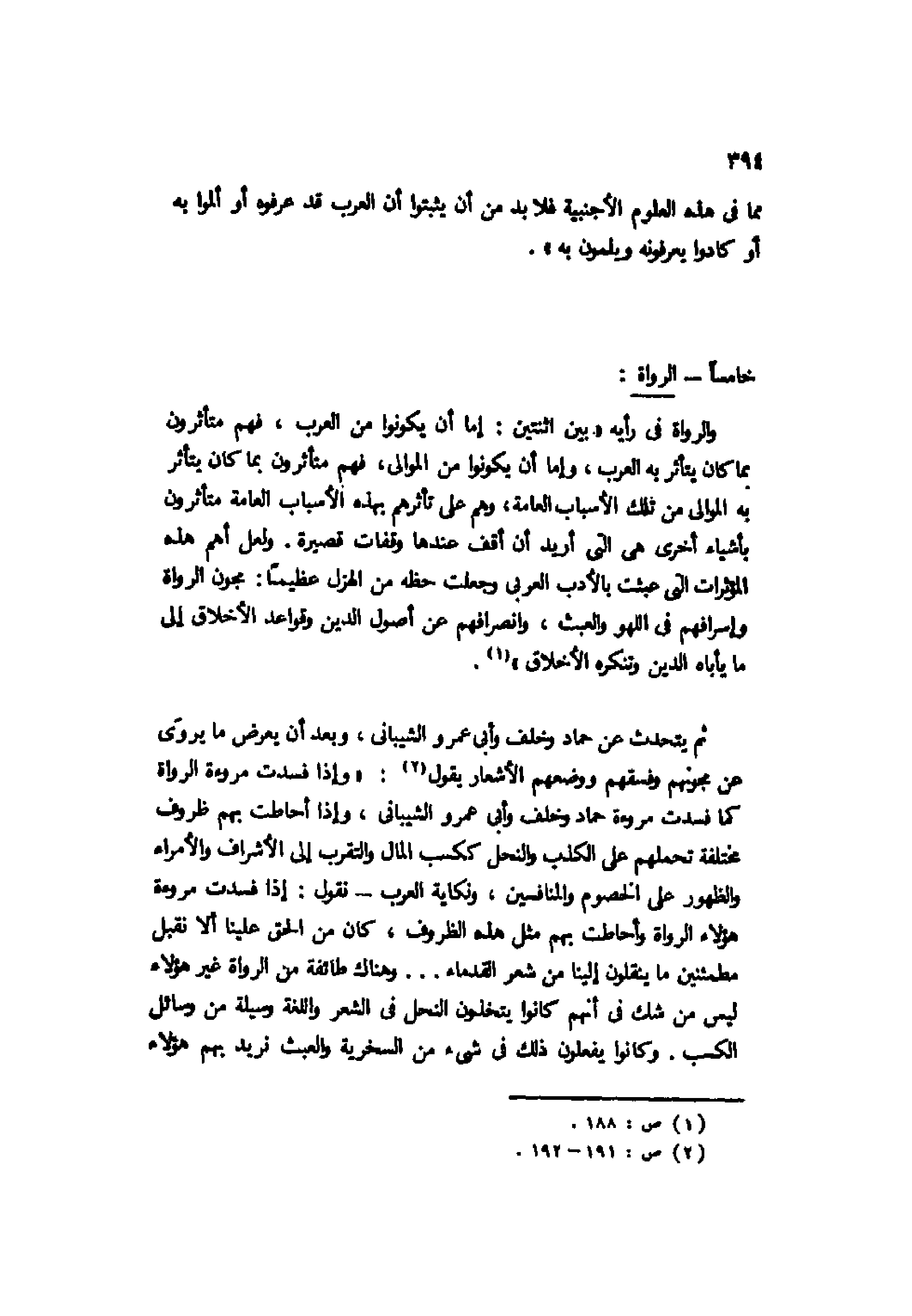 ثم يتحدث عن حماد وخلف وأبي عمرو الشيباني، وبعد أن يعرض ما يُروى عن مجونهم وفسقهم ووضعهم الأشعار يقول2: "وإذا فسدت مروءة الرواة كما فسدت مروءة حماد وخلف وأبي عمرو الشيباني، وإذا أحاطت بهم ظروف مختلفة تحملهم على الكذب والنحل ككسب المال والتقرب إلى الأشراف والأمراء والظهور على الخصوم والمنافسين، ونكاية العرب نقول: إذا فسدت مروءة هؤلاء الرواة وأحاطت بهم مثل هذه الظروف، كان من الحق علينا ألا نقبل مطمئنين ما ينقلون إلينا من شعر القدماء ... وهناك طائفة من الرواة غير هؤلاء ليس من شك في أنهم كانوا يتخذون النحل في الشعر واللغة وسيلة من وسائل الكسب. وكانوا يفعلون ذلك في شيء من السخرية والعبث نريد بهم هؤلاء