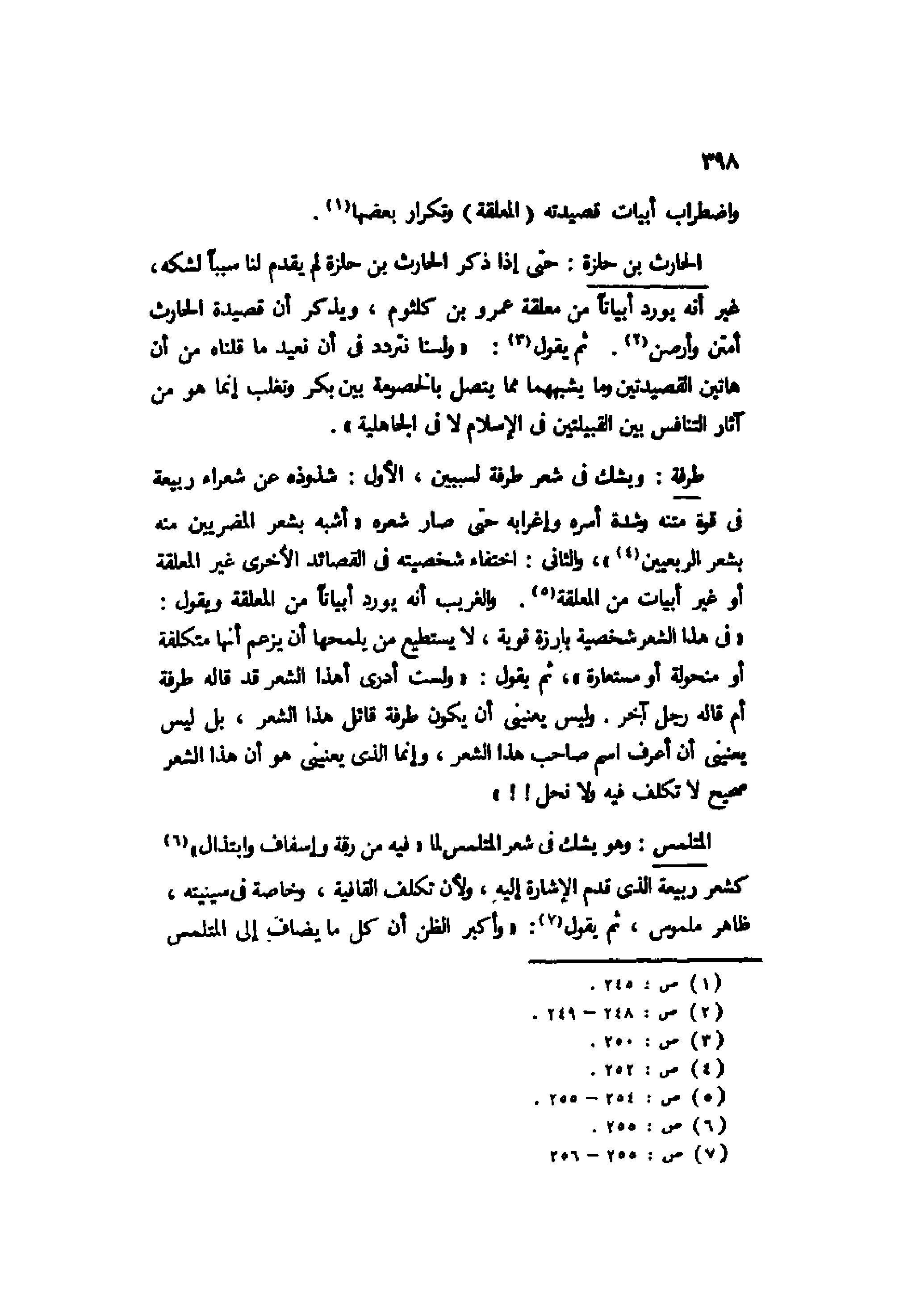 حتى إذا ذكر الحارث بن حلزة لم يقدم لنا سببًا لشكه، غير أنه يورد أبياتًا من معلقة عمرو بن كلثوم، ويذكر أن قصيدة الحارث أمتن وأرصن2. ثم يقول3: "ولسنا نتردد في أن نعيد ما قلناه من أن هاتين القصيدتين وما يشبههما مما يتصل بالخصومة بين بكر وتغلب إنما هو من آثار التنافس بين القبيلتين في الإسلام لا في الجاهلية".