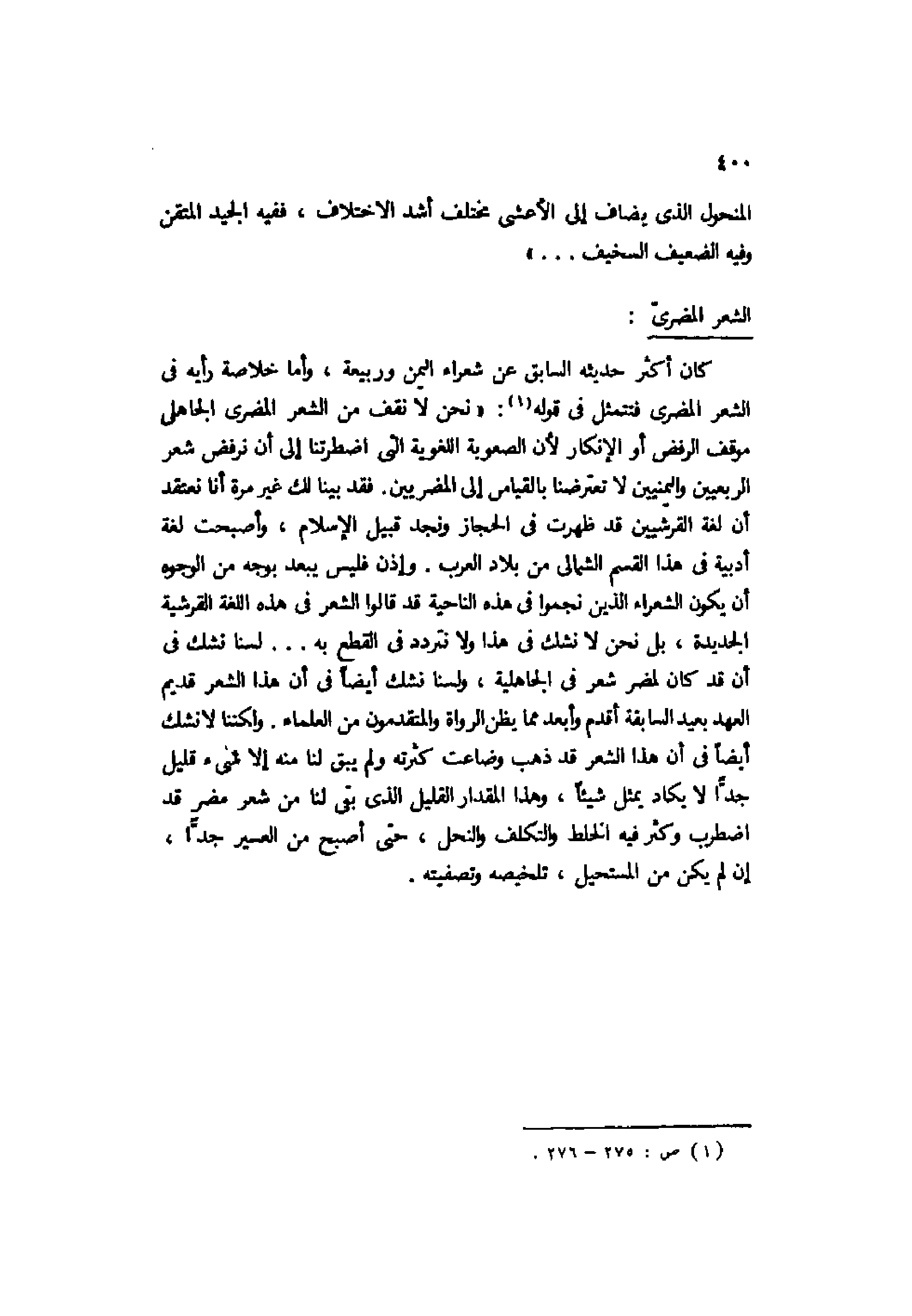 كان أكثر حديثه السابق عن شعراء اليمن وربيعة، وأما خلاصة رأيه في الشعر المضري فتتمثل في قوله1: "نحن لا نقف من الشعر المضري الجاهلي موقف الرفض أو الإنكار لأن الصعوبة اللغوية التي اضطرتنا إلى أن نرفض شعر الربعيين واليمنيين لا تعترضنا بالقياس إلى المضريين. فقد بينا لك غير مرة أنا نعتقد أن لغة القرشيين قد ظهرت في الحجاز ونجد قبيل الإسلام، وأصبحت لغة أدبية في هذا القسم الشمالي من بلاد العرب. وإذن فليس يبعد بوجه من الوجوه أن يكون الشعراء الذين نجموا في هذه الناحية قد قالوا الشعر في هذه اللغة القرشية الجديدة، بل نحن لا نشك في هذا ولا نتردد في القطع به ... لسنا نشك في أن قد كان لمضر شعر في الجاهلية، ولسنا نشك أيضًا في أن هذا الشعر قديم العهد بعيد السابقة أقدم وأبعد مما يظن الرواة والمتقدمون من العلماء. ولكننا لا نشك أيضًا في أن هذا الشعر قد ذهب وضاعت كثرته ولم يبق لنا منه إلا شيء قليل جدًّا لا يكاد يمثل شيئًا، وهذا المقدار القليل الذي بقي لنا من شعر مضر قد اضطرب وكثر فيه الخلط والتكلف والنحل، حتى أصبح من العسير جدًّا، إن لم يكن من المستحيل، تلخيصه وتصفيته.