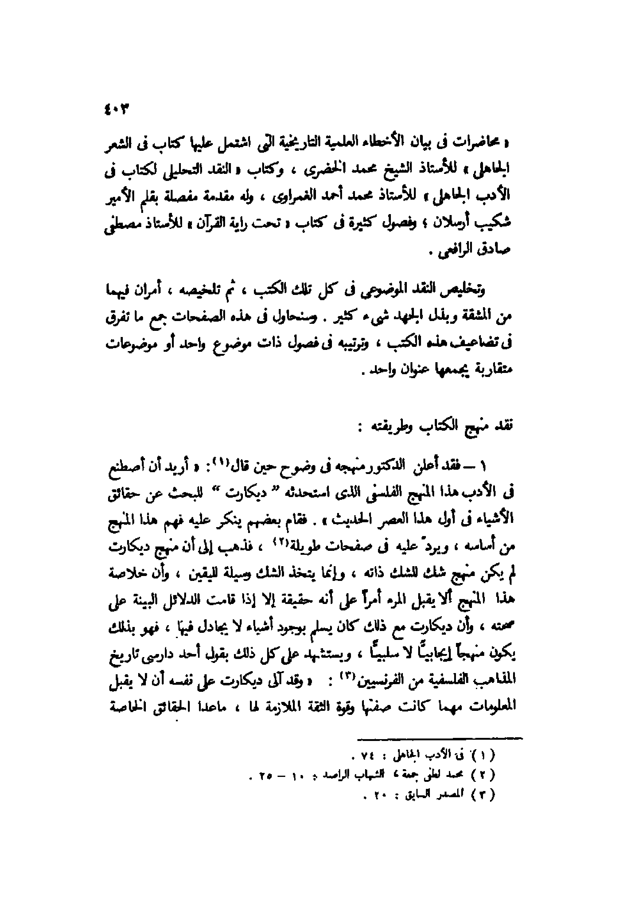 1- فقد أعلن الدكتور منهجه في وضوح حين قال1: "أريد أن أصطنع في الأدب هذا المنهج الفلسفي الذي استحدثه "ديكارت" للبحث عن حقائق الأشياء في أول هذا العصر الحديث". فقام بعضهم ينكر عليه فهم هذا المنهج من أساسه، ويرد عليه في صفحات طويلة2، فذهب إلى أن منهج ديكارت لم يكن منهج شك للشك ذاته، وإنما يتخذ الشك وسيلة لليقين، وأن خلاصة هذا المنهج ألا يقبل المرء أمرًا على أنه حقيقة إلا إذا قامت الدلائل البينة على صحته، وأن ديكارت مع ذلك كان يسلم بوجود أشياء لا يجادل فيها، فهو بذلك يكون منهجًا إيجابيًّا لا سلبيًّا، ويستشهد على كل ذلك بقول أحد دارسي تاريخ المذاهب الفلسفية من الفرنسيين3: "وقد آلى ديكارت على نفسه أن لا يقبل المعلومات مهما كانت صفتها وقوة الثقة الملازمة لها، ما عدا الحقائق الخاصة