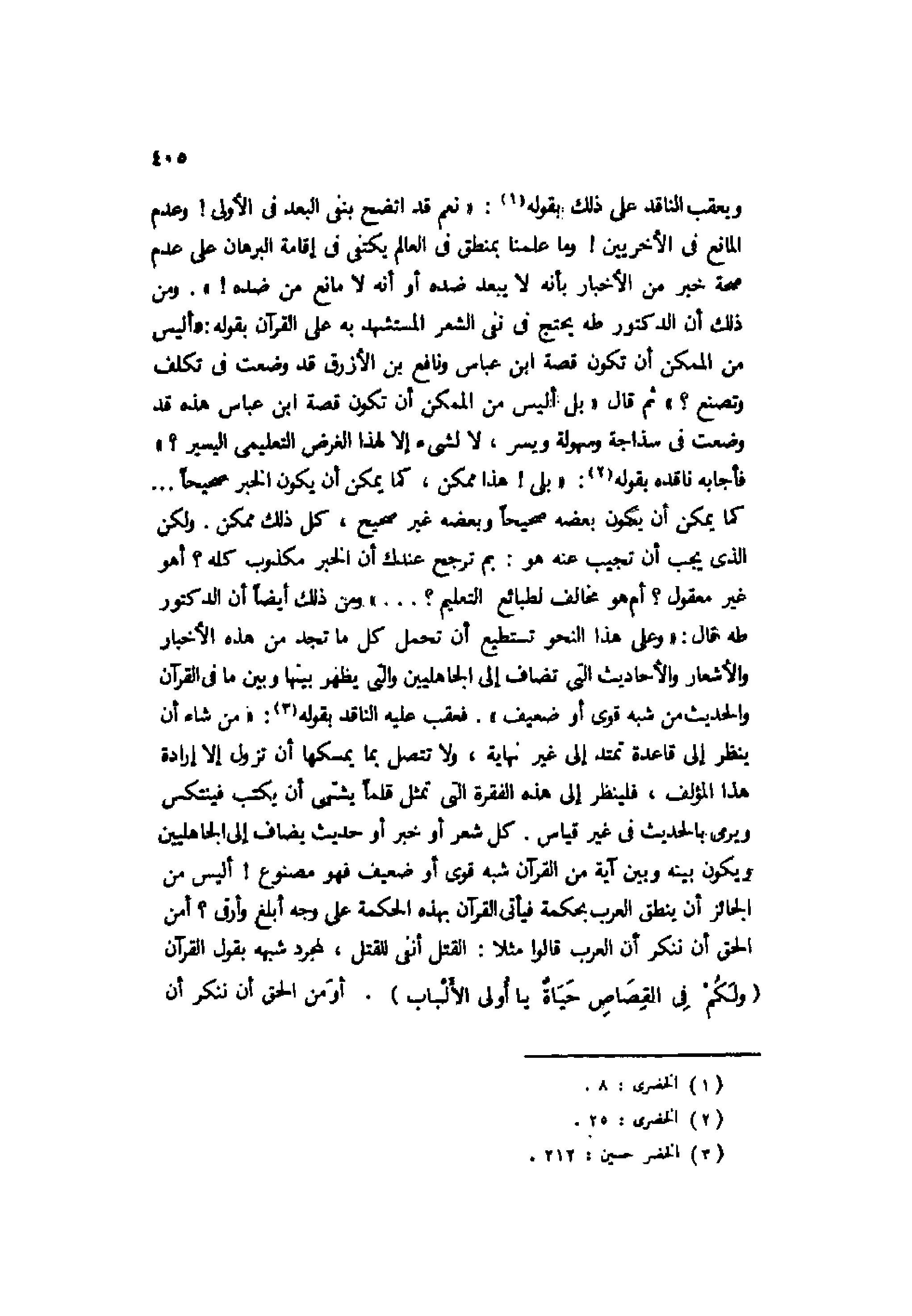 فأجابه ناقده بقوله2: "بلى! هذا ممكن، كما يمكن أن يكون الخبر صحيحًا ... كما يمكن أن يكون بعضه صحيحًا وبعضه غير صحيح، كل ذلك ممكن. ولكن الذي يجب أن تجيب عنه هو: بم ترجح عندك أن الخبر مكذوب كله؟ أهو غير معقول؟ أم هو مخالف لطبائع التعليم؟ ... " ومن ذلك أيضًا أن الدكتور طه قال: "وعلى هذا النحو تستطيع أن تحمل كل ما تجد من هذه الأخبار والأشعار والأحاديث التي تضاف إلى الجاهليين والتي يظهر بينها وبين ما في القرآن والحديث من شبه قوي أو ضعيف". فعقب عليه الناقد بقوله3: "من شاء أن ينظر إلى قاعدة تمتد إلى غير نهاية، ولا تتصل بما يمسكها أن تزول إلا إرادة هذا المؤلف، فلينظر إلى هذه الفقرة التي تمثل قلمًا يشتهي أن يكتب فينتكس ويرمي بالحديث في غير قياس. كل شعر أو خبر أو حديث يضاف إلى الجاهليين ويكون بينه وبين آية من القرآن شبه قوي أو ضعيف فهو مصنوع! أليس من الجائز أن ينطق العرب بحكمة فيأتي القرآن بهذه الحكمة على وجه أبلغ وأرقى؟ أمن الحق أن ننكر أن العرب قالوا مثلًا: القتل أنفى للقتل، لمجرد شبهه بقول القرآن {وَلَكُمْ فِي الْقِصَاصِ حَيَاةٌ يَا أُوْلِي الأَلْبَابِ} . أوَمن الحق أن ننكر أن