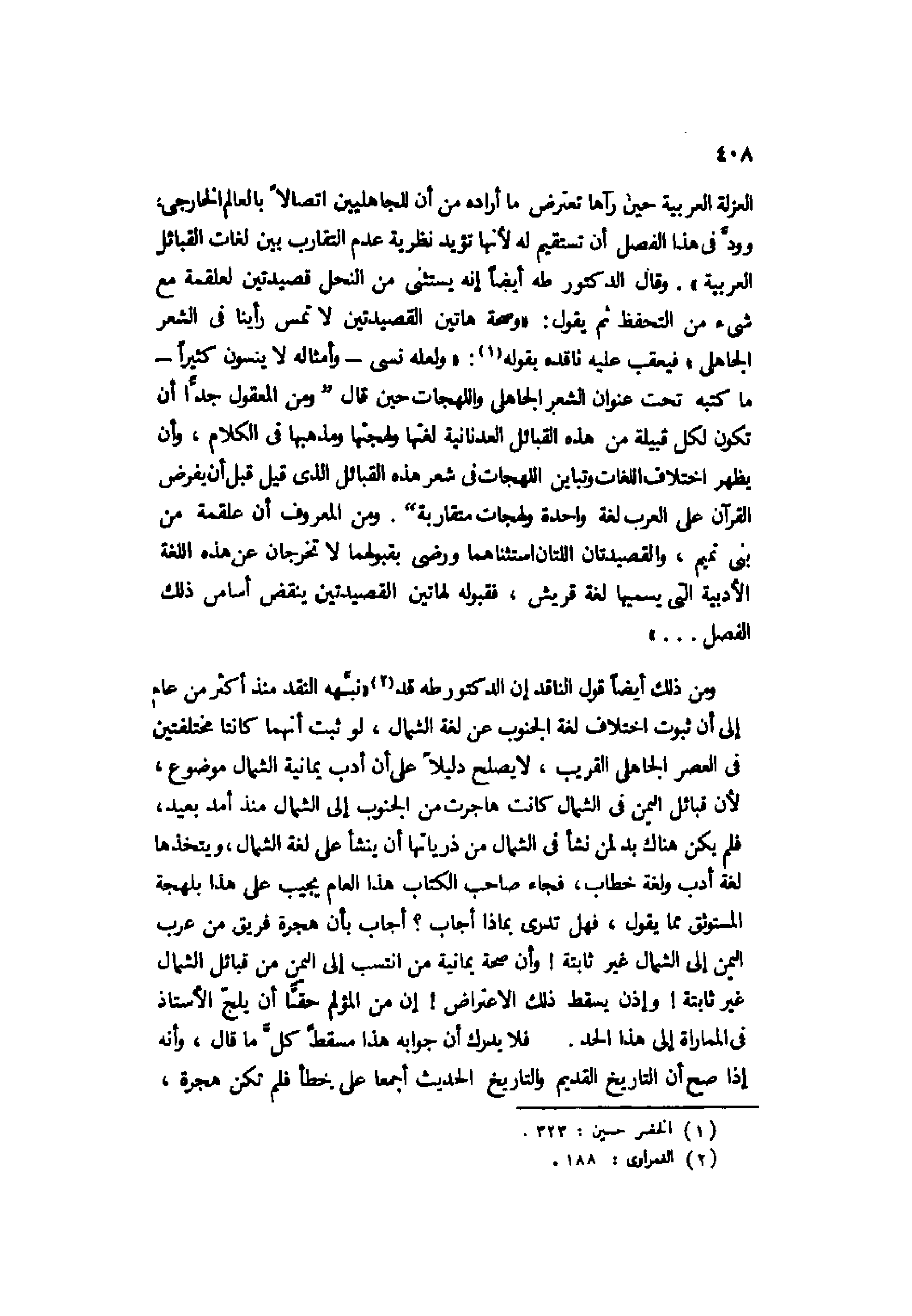 العزلة العربية حين رآها تعترض ما أراده من أن للجاهليين اتصالًا بالعالم الخارجي وود في هذا الفصل أن تستقيم له لأنها تؤيد نظرية عدم التقارب بين لغات القبائل العربية". وقال الدكتور طه أيضًا إنه يستثني من النحل قصيدتين لعلقمة مع شيء من التحفظ ثم يقول: "وصحة هاتين القصيدتين لا تمس رأينا في الشعر الجاهلي" فيعقب عليه ناقده بقوله1: "ولعله نسي -وأمثاله لا ينسون كثيرًا- ما كتبه تحت عنوان الشعر الجاهلي واللهجات حين قال "ومن المعقول جدًّا أن تكون لكل قبيلة من هذه القبائل العدنانية لغتها ولهجتها ومذهبها في الكلام، وأن يظهر اختلاف اللغات وتباين اللهجات في شعر هذه القبائل الذي قيل قبل أن يفرض القرآن على العرب لغة واحدة ولهجات متقاربة". ومن المعروف أن علقمة من بني تميم، والقصيدتان اللتان استثناهما ورضي بقبولهما لا تخرجان عن هذه اللغة الأدبية التي يسميها لغة قريش، فقبوله لهاتين القصيدتين ينقض أساس ذلك الفصل ... ".