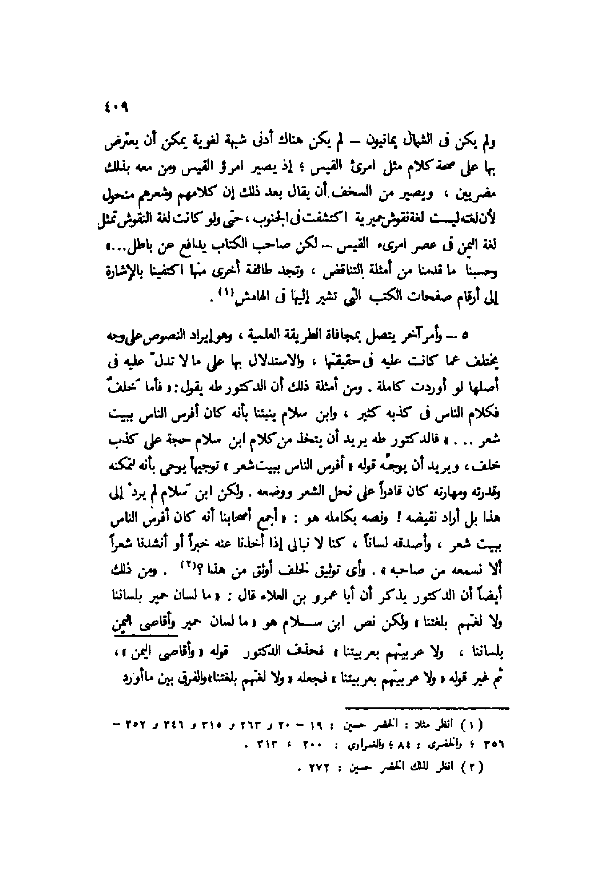 ولم يكن في الشمال يمانيون لم يكن هناك أدنى شبهة لغوية يمكن أن يعترض بها على صحة كلام مثل امرئ القيس؛ إذ يصير امرؤ القيس ومن معه بذلك مضريين، ويصير من السخف أن يقال بعد ذلك إن كلامهم وشعرهم منحول لأن لغته ليست لغة نقوش حميرية اكتشفت في الجنوب، حتى ولو كانت لغة النقوش تمثل لغة اليمن في عصر امرئ القيس لكن صاحب الكتاب يدافع عن باطل ... ".