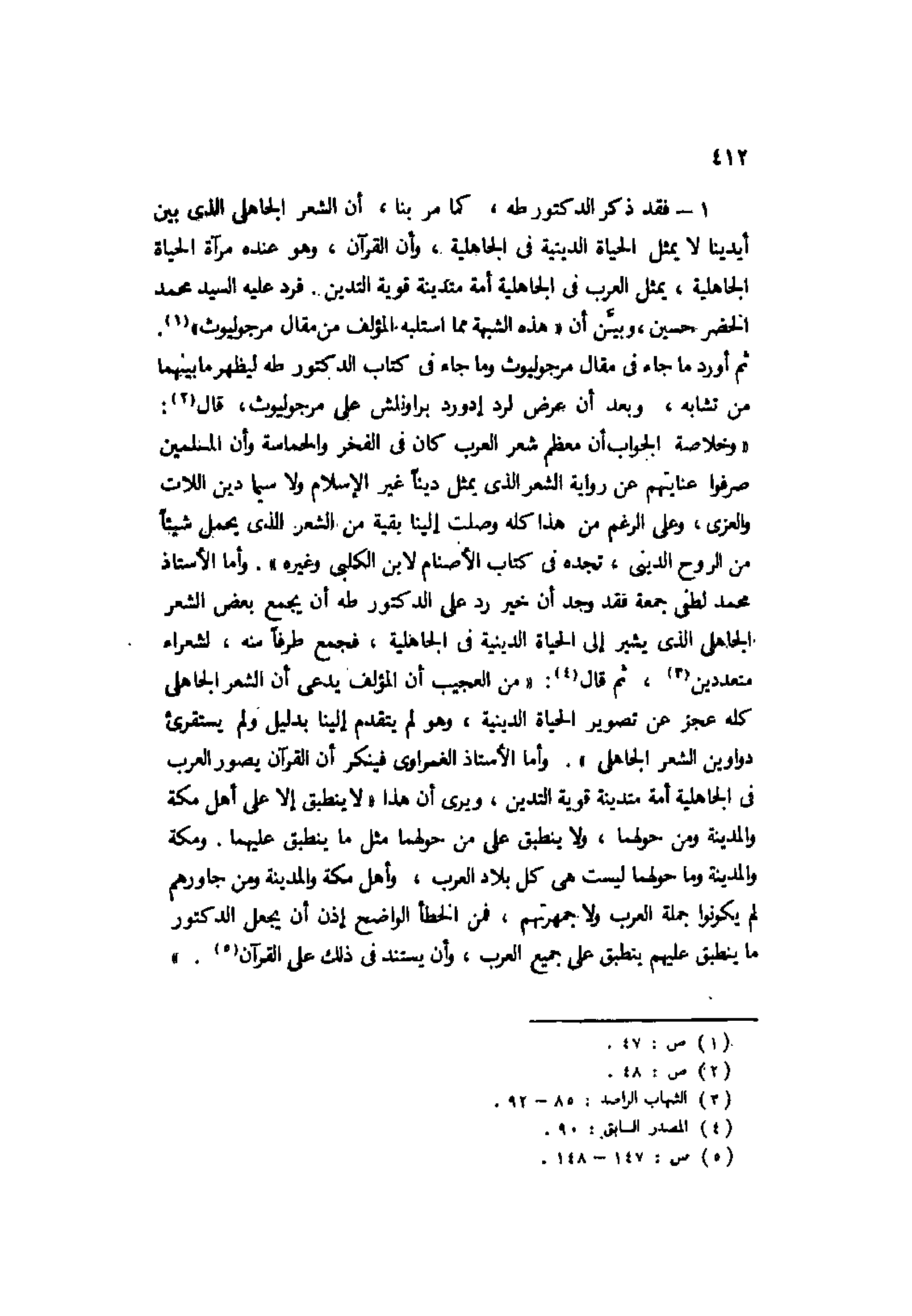 1- فقد ذكر الدكتور طه، كما مر بنا، أن الشعر الجاهلي الذي بين أيدينا لا يمثل الحياة الدينية في الجاهلية، وأن القرآن، وهو عنده مرآة الحياة الجاهلية، يمثل العرب في الجاهلية أمة متدينة قوية التدين. فرد عليه السيد محمد الخضر حسين، وبين أن "هذه الشبهة مما استلبه المؤلف من مقال مرجوليوث"1.