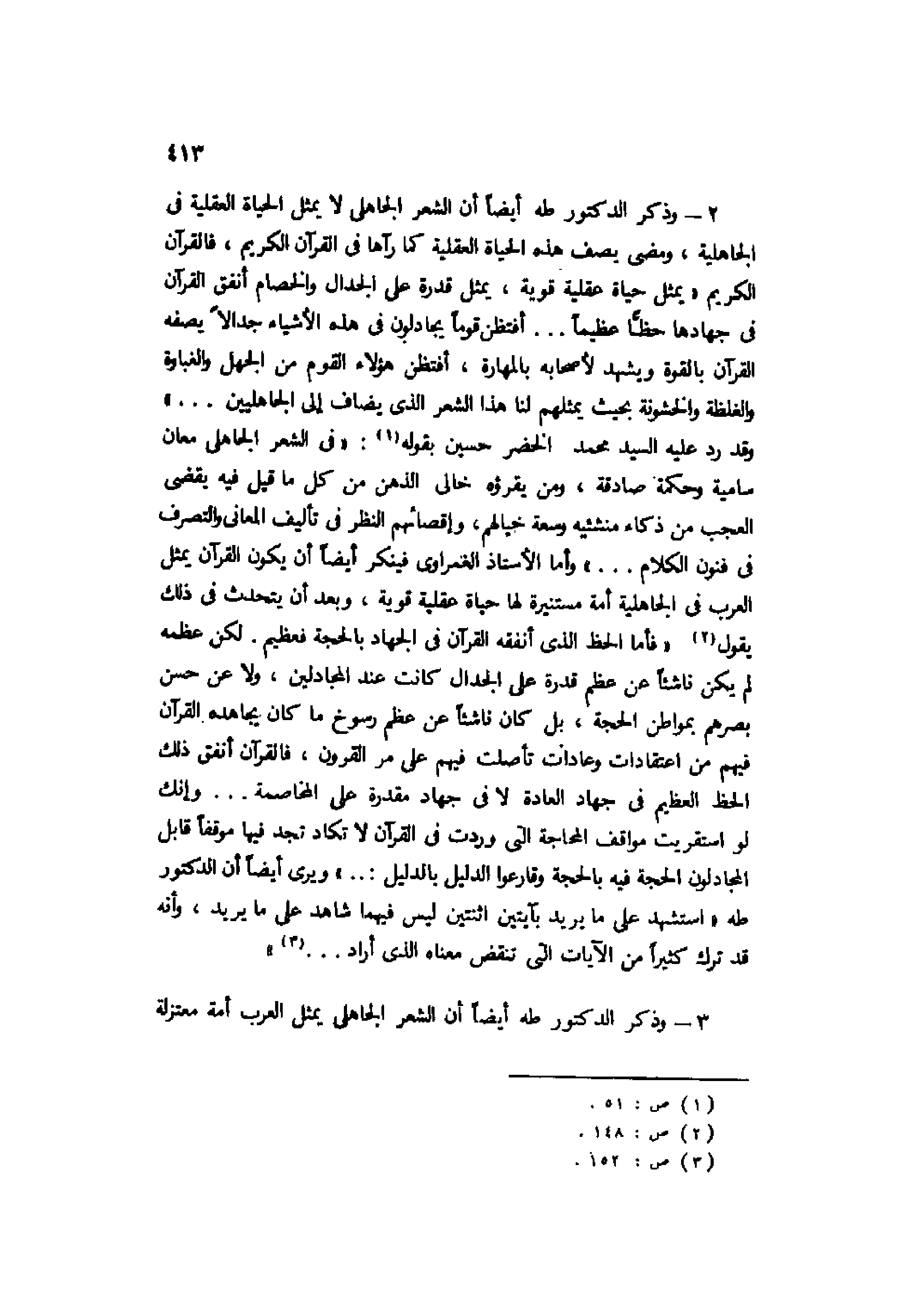 2- وذكر الدكتور طه أيضًا أن الشعر الجاهلي لا يمثل الحياة العقلية في الجاهلية، ومضى يصف هذه الحياة العقلية كما رآها في القرآن الكريم، فالقرآن الكريم يمثل حياة عقلية قوية، يمثل قدرة على الجدال والخصام أنفق القرآن في جهادها حظًّا عظيمًا ... أفتظن قومًا يجادلون في هذه الأشياء جدالًا يصفه القرآن بالقوة ويشهد لأصحابه بالمهارة، أفتظن هؤلاء القوم من الجهل والغباوة والغلظة والخشونة بحيث يمثلهم لنا هذا الشعر الذي يضاف إلى الجاهليين ... ".