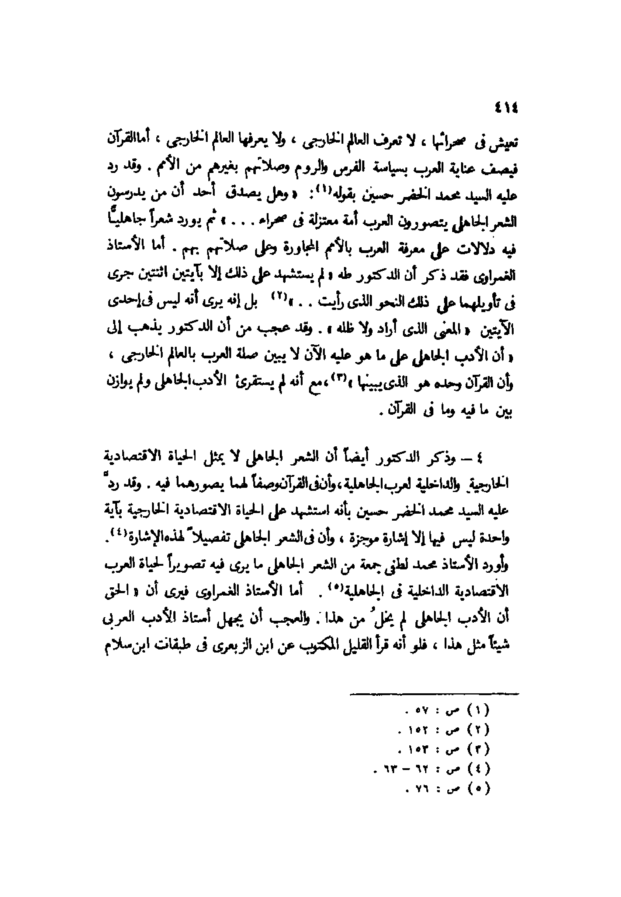 4- وذكر الدكتور أيضًا أن الشعر الجاهلي لا يمثل الحياة الاقتصادية الخارجية والداخلية لعرب الجاهلية، وأن في القرآن وصفًا لهما يصورهما فيه. وقد رد عليه السيد محمد الحضر حسين بأنه استشهد على الحياة الاقتصادية الخارجية بآية واحدة ليس فيها إلا إشارة موجزة، وأن في الشعر الجاهلي تفصيلًا لهذه الإشارة4.