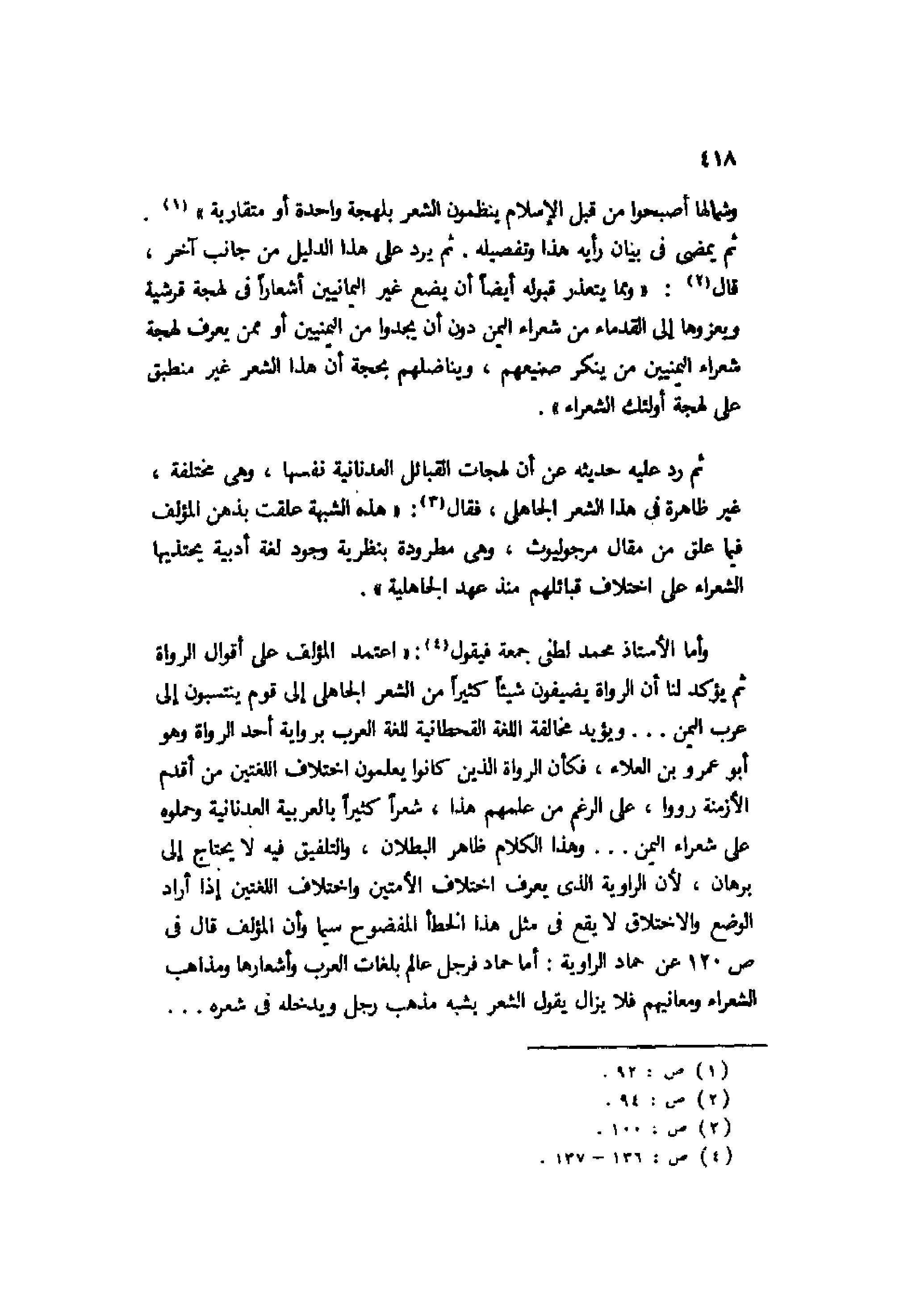 ثم رد عليه حديثه على أن لهجات القبائل العدنانية نفسها، وهي مختلفة، غير ظاهرة في هذا الشعر الجاهلي، فقال3: "هذه الشبهة علقت بذهن المؤلف فيما علق من مقال مرجوليوث، وهي مطرودة بنظرية وجود لغة أدبية يحتذيها الشعراء على اختلاف قبائلهم منذ عهد الجاهلية".