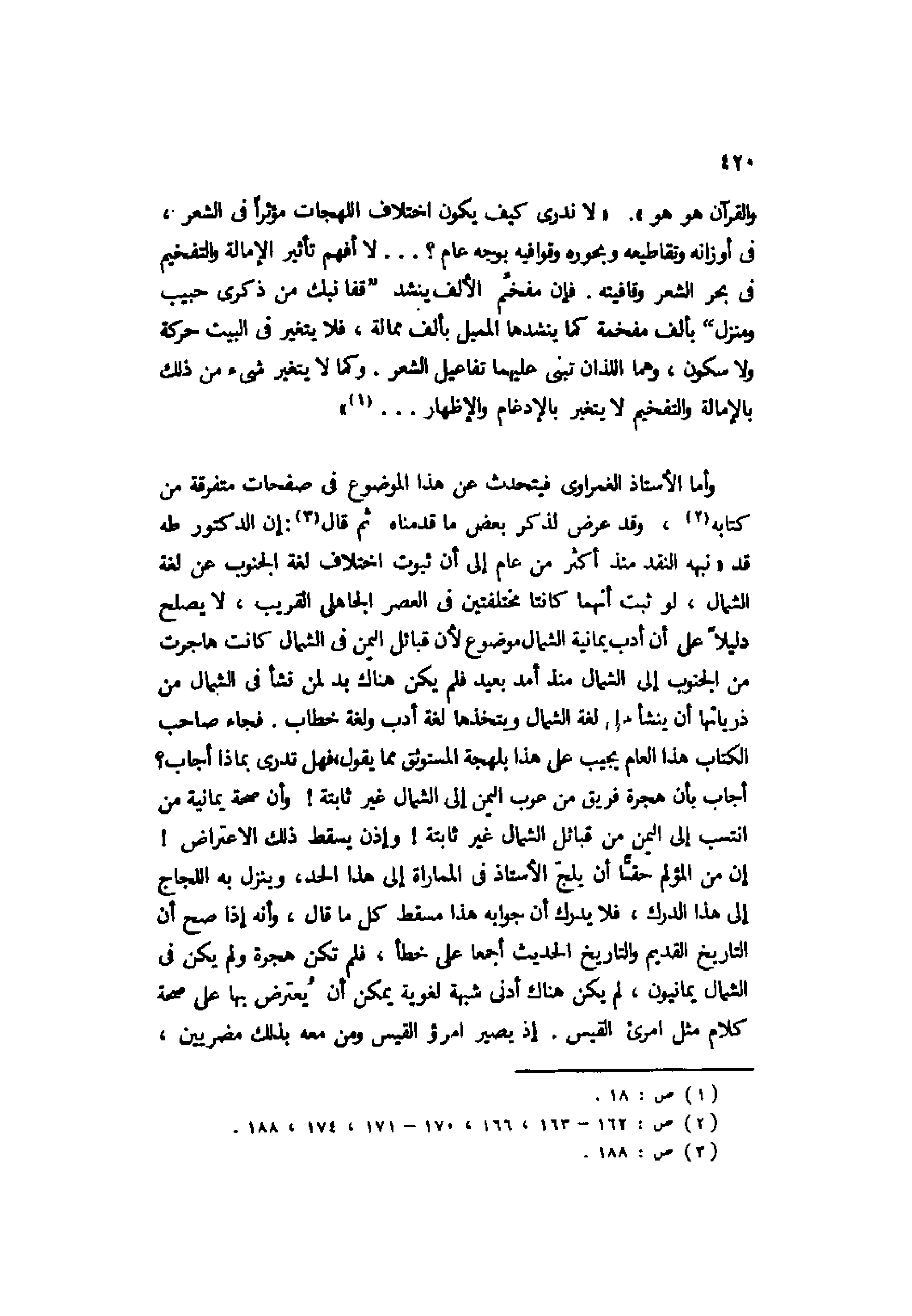 والقرآن هو هو". "لا ندري كيف يكون اختلاف اللهجات مؤثرًا في الشعر، في أوزانه وتقاطيعه وبحوره وقوافيه بوجه عام؟ ... لا أفهم تأثير الإمالة والتفخيم في بحر الشعر وقافيته. فإن مفخم الألف ينشد "قفا نبك في ذكرى حبيب ومنزل" بألف مفخمة كما ينشدها المميل بألف ممالة، فلا يتغير في البيت حركة ولا سكون، وهما اللذان تُبنى عليها تفاعيل الشعر. وكما لا يتغير شيء من ذلك بالإمالة والتفخيم لا يتغير بالإدغام والإظهار ... 1".