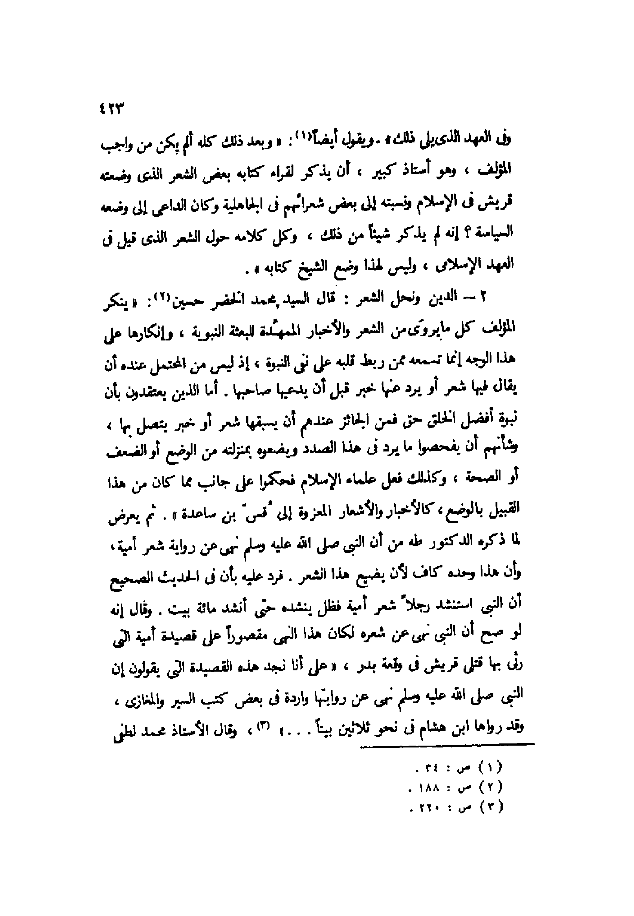 وفي العهد الذي يلي ذلك". ويقول أيضًا1: "وبعد ذلك كله ألم يكن من واجب المؤلف، وهو أستاذ كبير، أن يذكر لقراء كتابه بعض الشعر الذي وضعته قريش في الإسلام ونسبته إلى بعض شعرائهم في الجاهلية وكان الداعي إلى وضعه السياسة؟ إنما لم يذكر شيئًا من ذلك، وكل كلامه حول الشعر الذي قيل في العهد الإسلامي، وليس لهذا وضع الشيخ كتابه".