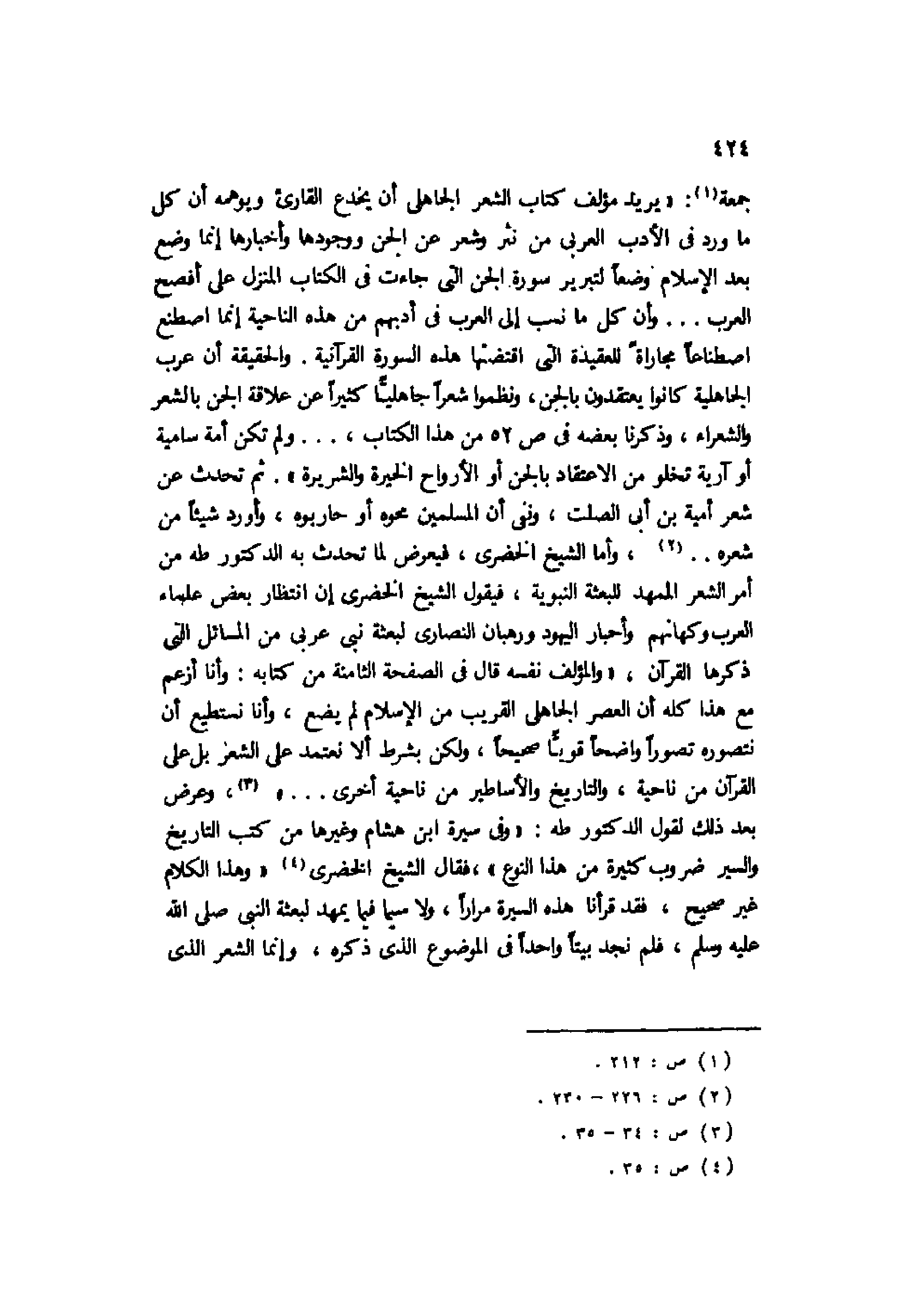 جمعة1: "يريد مؤلف كتاب الشعر الجاهلي أن يخدع القارئ ويوهمه أن كل ما ورد في الأدب العربي من نثر وشعر عن الجن ووجودها وأخبارها إنما وضع بعد الإسلام وضعًا لتبرير سورة الجن التي جاءت في الكتاب المنزل على أفصح العرب ... وأن كل ما نسب إلى العرب في أدبهم من هذه الناحية إنما اصطنع اصطناعًا مجاراةً للعقيدة التي اقتضتها هذه السورة القرآنية. والحقيقة أن عرب الجاهلية كانوا يعتقدون بالجن، ونظموا شعرًا جاهليًّا كثيرًا عن علاقة الجن بالشعر والشعراء، وذكرنا بعضه في ص52 من هذا الكتاب ... ولم تكن أمة سامية أو آرية تخلو من الاعتقاد بالجن أو الأرواح الخيرة والشريرة". ثم تحدث عن شعر أمية بن أبي الصلت، ونفى أن المسلمين محوه أو حاربوه، وأورد شيئًا من شعره ... 2، وأما الشيخ الخضري، فيعرض لما تحدث به الدكتور طه من أمر الشعر الممهد للبعثة النبوية، فيقول الشيخ الخضري إن انتظار بعض علماء العرب وكهانهم وأحبار اليهود ورهبان النصارى لبعثة نبي عربي من المسائل التي ذكرها القرآن، "والمؤلف نفسه قال في الصحيفة الثامنة من كتابه: وأنا أزعم مع هذا كله أن العصر الجاهلي القريب من الإسلام لم يضع، وأنا نستطيع أن نتصوره تصورًا واضحًا قويًّا صحيحًا، ولكن بشرط ألا نعتمد على الشعر بل على القرآن من ناحية، والتاريخ والأساطير من ناحية أخرى ... "3، وعرض بعد ذلك لقول الدكتور طه: "وفي سيرة ابن هشام وغيرها من كتب التاريخ والسير ضروب كثيرة من هذا النوع"، فقال الشيخ الخضري4 "وهذا الكلام غير صحيح، فقد قرأنا هذه السيرة مرارًا، ولا سيما فيما يمهد لبعثة النبي صلى الله عليه وسلم، فلم نجد بيتًا واحدًا في الموضوع الذي ذكره، وإنما الشعر الذي