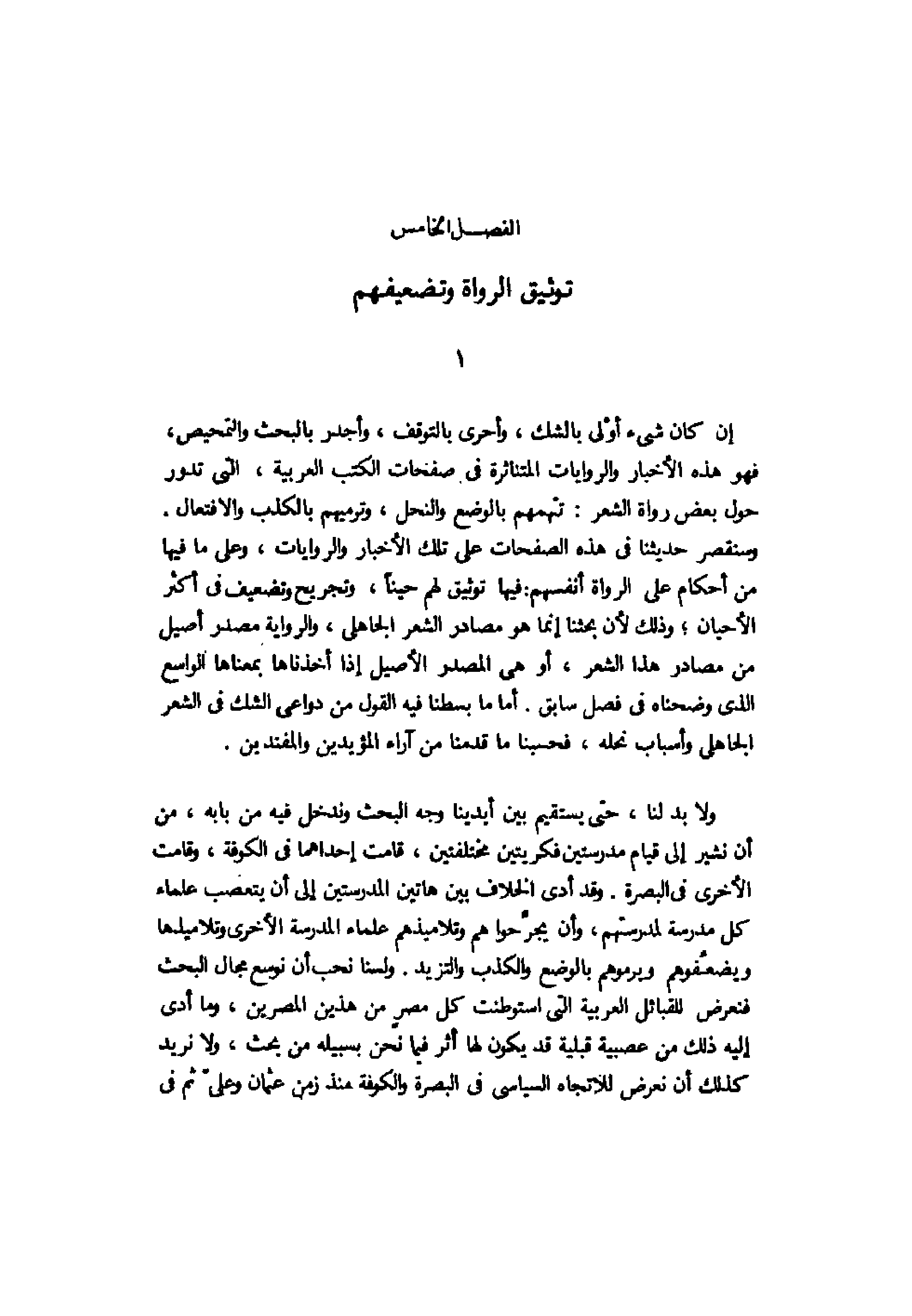 إن كان شيء أولى بالشك، وأحرى بالتوقف، وأجدر بالبحث والتمحيص، فهو هذه الأخبار والروايات المتناثرة في صفحات الكتب العربية، التي تدور حول بعض رواة الشعر: تتهمهم بالوضع والنحل، وترميهم بالكذب والافتعال. وسنقصر حديثنا في هذه الصفحات على تلك الأخبار والروايات، وعلى ما فيها من أحكام على الرواة أنفسهم: فيها توثيق لهم حينًا، وتجريح وتضعيف في أكثر الأحيان؛ وذلك لأن بحثنا إنما هو مصادر الشعر الجاهلي، والرواية مصدر أصيل من مصادر هذا الشعر، أو هي المصدر الأصيل إذا أخذناها بمعناها الواسع الذي وضحناه في فصل سابق. أما ما بسطنا فيه القول من دواعي الشك في الشعر الجاهلي وأسباب نحله، فحسبنا ما قدمنا من آراء المؤيدين والمفندين.