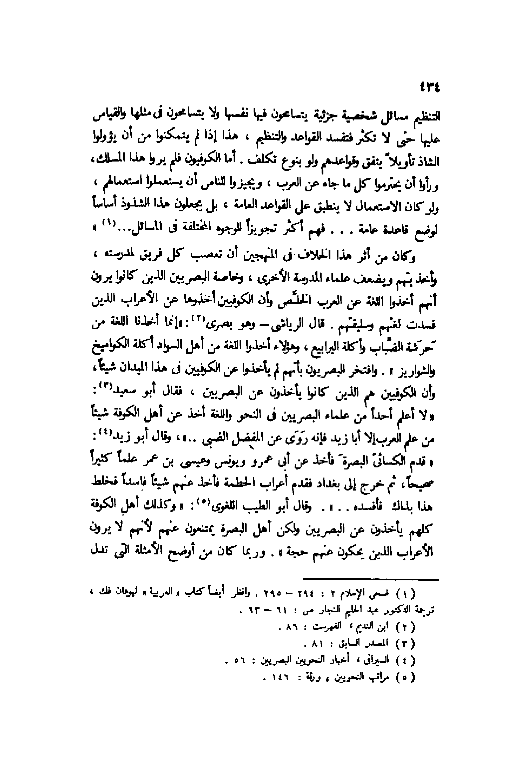 "قدم الكسائي البصرة فأخذ عن أبي عمرو ويونس وعيسى بن عمر علمًا كثيرًا صحيحًا، ثم خرج إلى بغداد فقد أعراب الحطمة فأخذ عنهم شيئًا فاسدًا فخلط هذا بذاك فأفسده ... ". وقال أبو الطيب اللغوي5: "وكذلك أهل الكوفة كلهم يأخذون عن البصريين ولكن أهل البصرة يمتنعون عنهم لأنهم لا يرون الأعراب الذين يحكون عنهم حجة". وربما كان من أوضح الأمثلة التي تدل