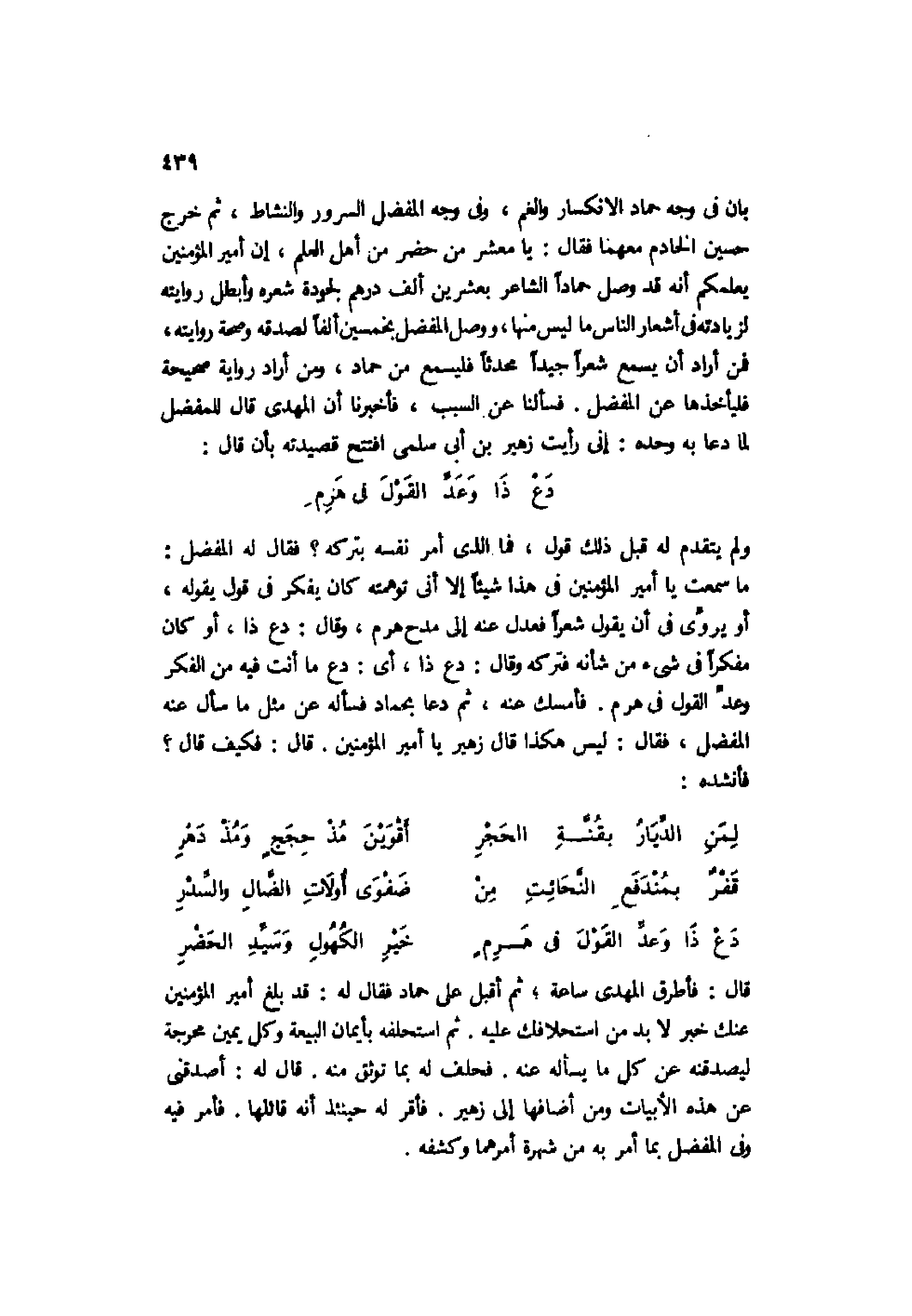 بان في وجه حماد الانكسار والغم، وفي وجه المفضل السرور والنشاط، ثم خرج حسين الخادم معهما فقال: يا معشر من حضر من أهل العلم، إن أمير المؤمنين يعلمكم أنه قد وصل حمادًا الشاعر بعشرين ألف درهم لجودة شعره وأبطل روايته لزيادته في أشعار الناس ما ليس منها، ووصل المفضل بخمسين ألفًا لصدقه وصحة روايته، فمن أراد أن يسمع شعرًا جيدًا محدثًا فليسمع من حماد، ومن أراد رواية صحيحة فليأخذها عن المفضل. فسألنا عن السبب، فأخبرنا أن المهدي قال للمفضل لما دعا به وحده: إني رأيت زهير بن أبي سلمى افتتح قصيدته بأن قال: