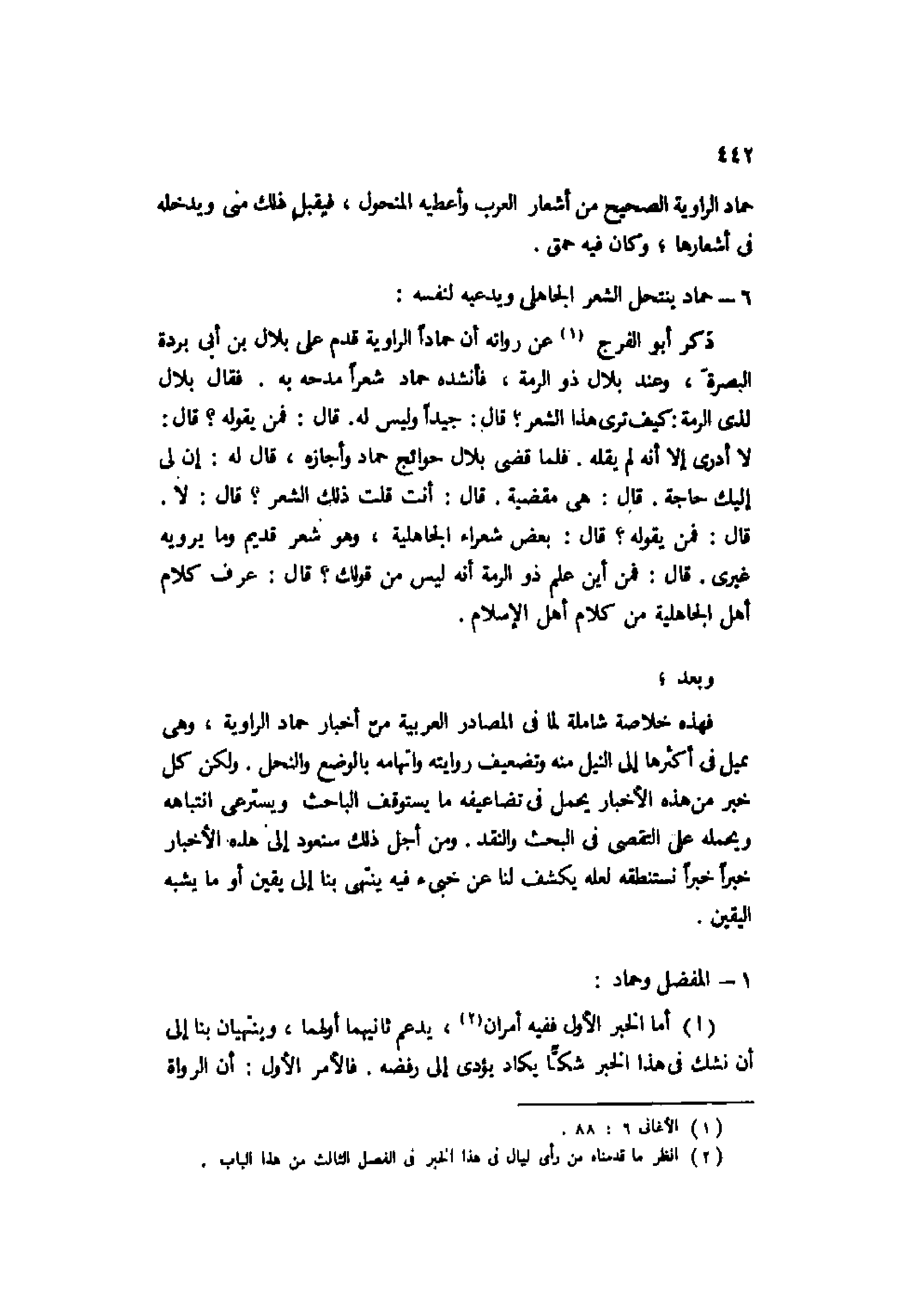 فهذه خلاصة شاملة لما في المصادر العربية من أخبار حماد الراوية، وهي تميل في أكثرها إلى النيل منه وتضعيف روايته واتهامه بالوضع والنحل. ولكن كل خبر من هذه الأخبار يحمل في تضاعيفه ما يستوقف الباحث ويسترعي انتباهه ويحمله على التقصي في البحث والنقد. ومن أجل ذلك سنعود إلى هذه الأخبار خبرًا خبرًا نستنطقه لعله يكشف لنا عن خبئ فيه ينتهي بنا إلى يقين أو ما يشبه اليقين.
