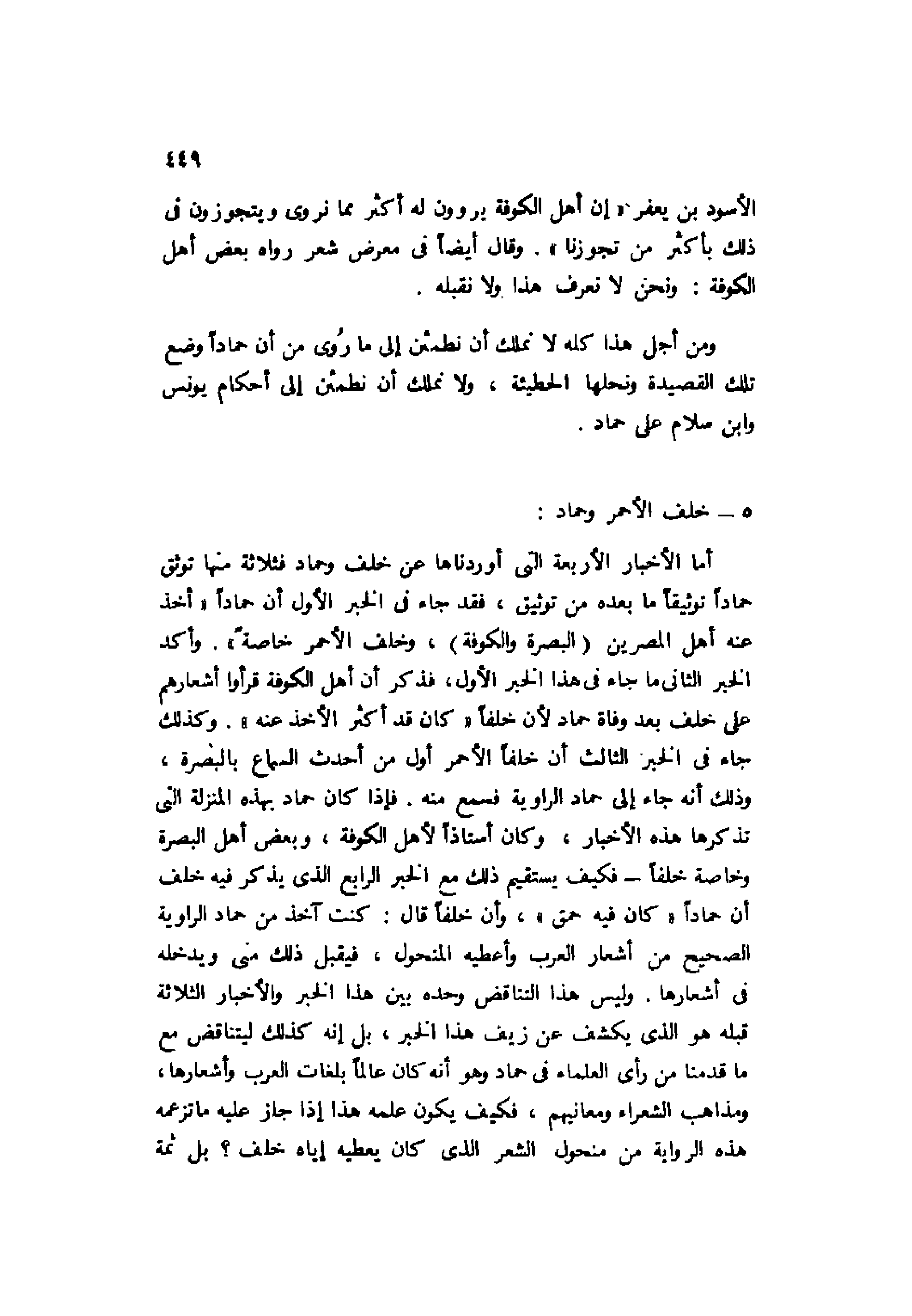 أما الأخبار الأربعة التي أوردناها عن خلف وحماد فثلاثة منها توثق حمادًا توثيقًا ما بعده من توثيق، فقد جاء في الخبر الأول أن حمادًا "أخذ عنه أهل المصرين "البصرة والكوفة"، وخلف الأحمر خاصة". وأكد الخبر الثاني ما جاء في هذا الخبر الأول، فذكر أن أهل الكوفة قرءوا أشعارهم على خلف بعد وفاة حماد لأن خلفًا "كان قد أكثر الأخذ عنه". وكذلك جاء في الخبر الثالث أن خلفًا الأحمر أول من أحدث السماع بالبصرة، وذلك أنه جاء إلى حماد الراوية فسمع منه. فإذا كان حماد بهذه المنزلة التي تذكرها هذه الأخبار، وكان أستاذًا لأهل الكوفة، وبعض أهل البصرة وخاصة خلفًا فكيف يستقيم ذلك مع الخبر الرابع الذي يذكر فيه خلف أن حمادًا "كان فيه حمق"، وأن خلفًا قال: كنت آخذ من حماد الراوية الصحيح من أشعار العرب وأعطيه المنحول، فيقبل ذلك مني ويدخله في أشعارها. وليس هذا التناقض وحده بين هذا الخبر والأخبار الثلاثة قبله هو الذي يكشف عن زيف هذا الجبر، بل إنه كذلك ليتناقض مع ما قدمنا من رأي العلماء في حماد وهو أنه كان عالمًا بلغات العرب وأشعارها، ومذاهب الشعراء معانيهم، فكيف يكون علمه هذا إذا جاز عليه ما تزعمه هذه الرواية من منحول الشعر الذي كان يعطيه إياه خلف؟ بل ثمة