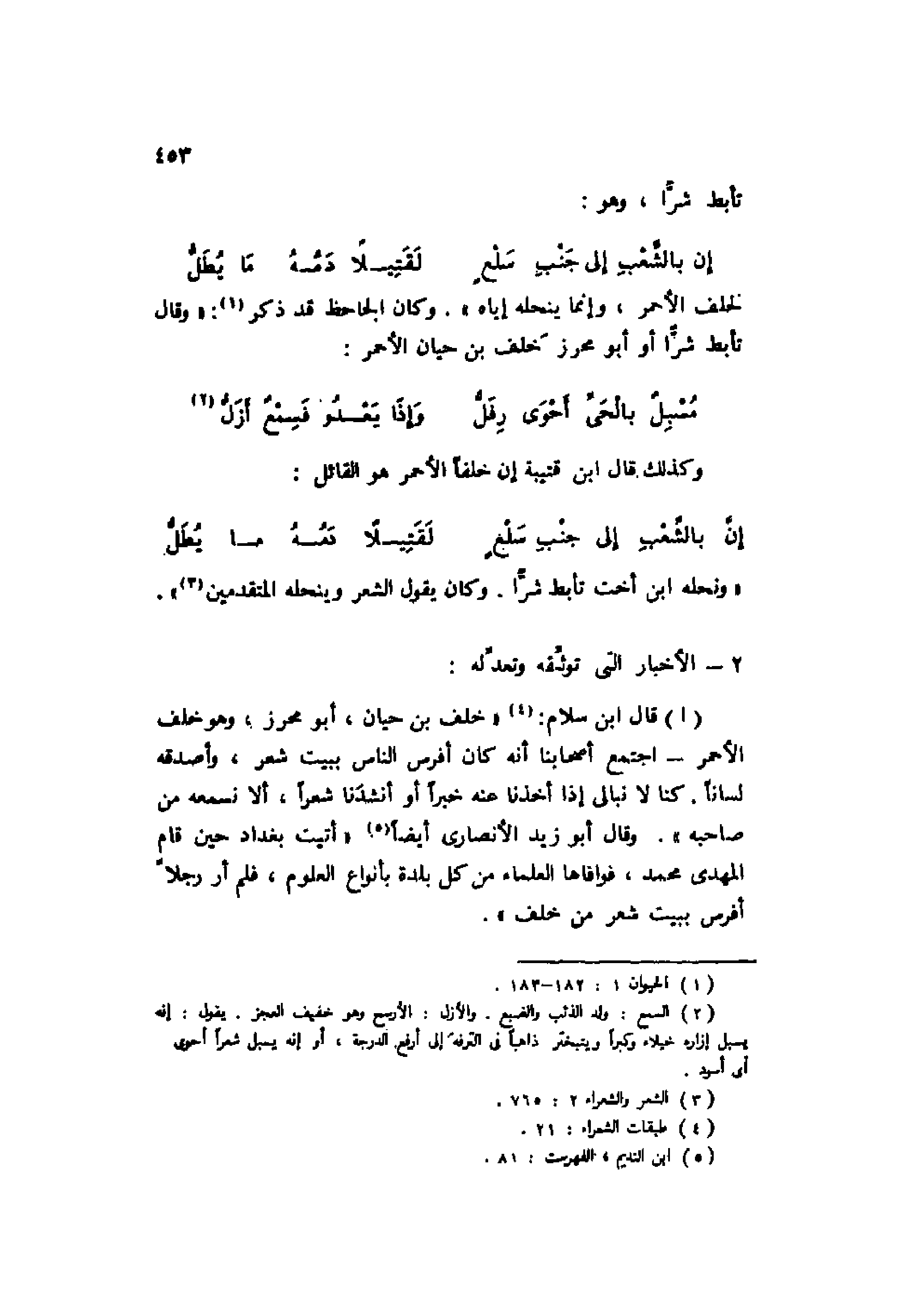 لخلف الأحمر، وإنما ينحله إياه". وكان الجاحظ قد ذكر1: "وقال تأبط شرًّا أو أبو محرز خلف بن حيان الأحمر: