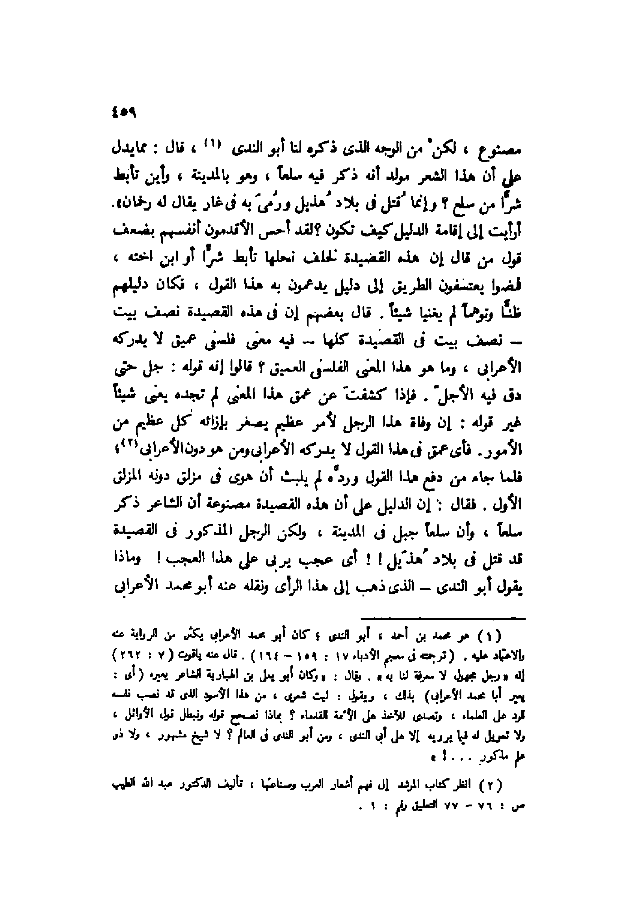 أرأيت إلى إقامة الدليل كيف تكون؟ لقد أحس الأقدمون أنفسهم بضعف قول من قال إن هذه القصيدة لخلف نحلها تأبط شرًّا أو ابن أخته، فمضوا يعتسفون الطريق إلى دليل يدعمون به هذا القول، فكان دليلهم ظنًّا وتوهمًا لم يغنيا شيئًا. قال بعضهم إن في هذه القصيدة نصف بيت -نصف بيت في القصيدة كلها- فيه معنى فلسفي عميق لا يدركه الأعرابي، وما هو هذا المعنى الفلسفي العميق؟ قالوا إنه قوله: جل حتى دق فيه الأجل. فإذا كشفت عن عمق هذا المعنى لم تجده يعني شيئًا غير قوله: إن وفاة هذا الرجل لأمر عظيم يصغر بإزائه كل عظيم من الأمور. فأي عمق في هذا القول لا يدركه الأعرابي ومن هو دون الأعرابي2؛ فلما جاء من دفع هذا القول ورده لم يلبث أن هوى في مزلق دونه المزلق الأول، فقال: إن الدليل على أن هذه القصيدة مصنوعة أن الشاعر ذكر سلعًا، وأن سلعًا جبل في المدينة، ولكن الرجل المذكور في القصيدة قد قتل في بلاد هذيل!! أي عجب يربى على هذا العجب! وماذا يقول أبو الندى -الذي ذهب إلى هذا الرأي ونقله عنه أبو محمد الأعرابي-