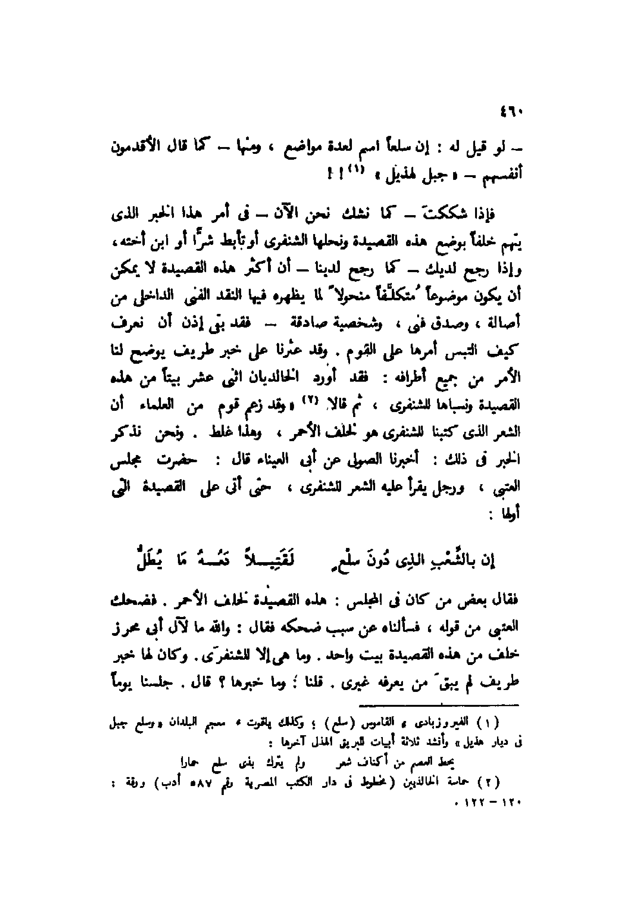 فإذا شككت -كما نشك نحن الآن- في أمر هذا الخبر الذي يتهم خلفًا بوضع هذه القصيدة ونحلها الشنفرى أو تأبط شرًّا أو ابن أخته، وإذا رجح لديك -كما رجح لدينا- أن أكثر هذه القصيدة لا يمكن أن يكون موضوعًا متكلفًا منحولًا لما يظهره فيها النقد الفني الداخلي من أصالة، وصدق فني، وشخصية صادقة - فقد بقي إذن أن نعرف كيف التبس أمرها على القوم. وقد عثرنا على خبر طريف يوضح لنا الأمر من جميع أطرافه: فقد أورد الخالديان اثني عشر بيتًا من هذه القصيدة ونسباها للشنفرى، ثم قالا2 "وقد زعم قوم من العلماء أن الشعر الذي كتبنا للشنفرى هو لخلف الأحمر، وهذا غلط. ونحن نذكر الخبر في ذلك: أخبرنا الصولي عن أبي العيناء قال: حضرت مجلس العتبي، ورجل يقرأ عليه الشعر للشنفرى، حتى أتى على القصيدة التي أولها: