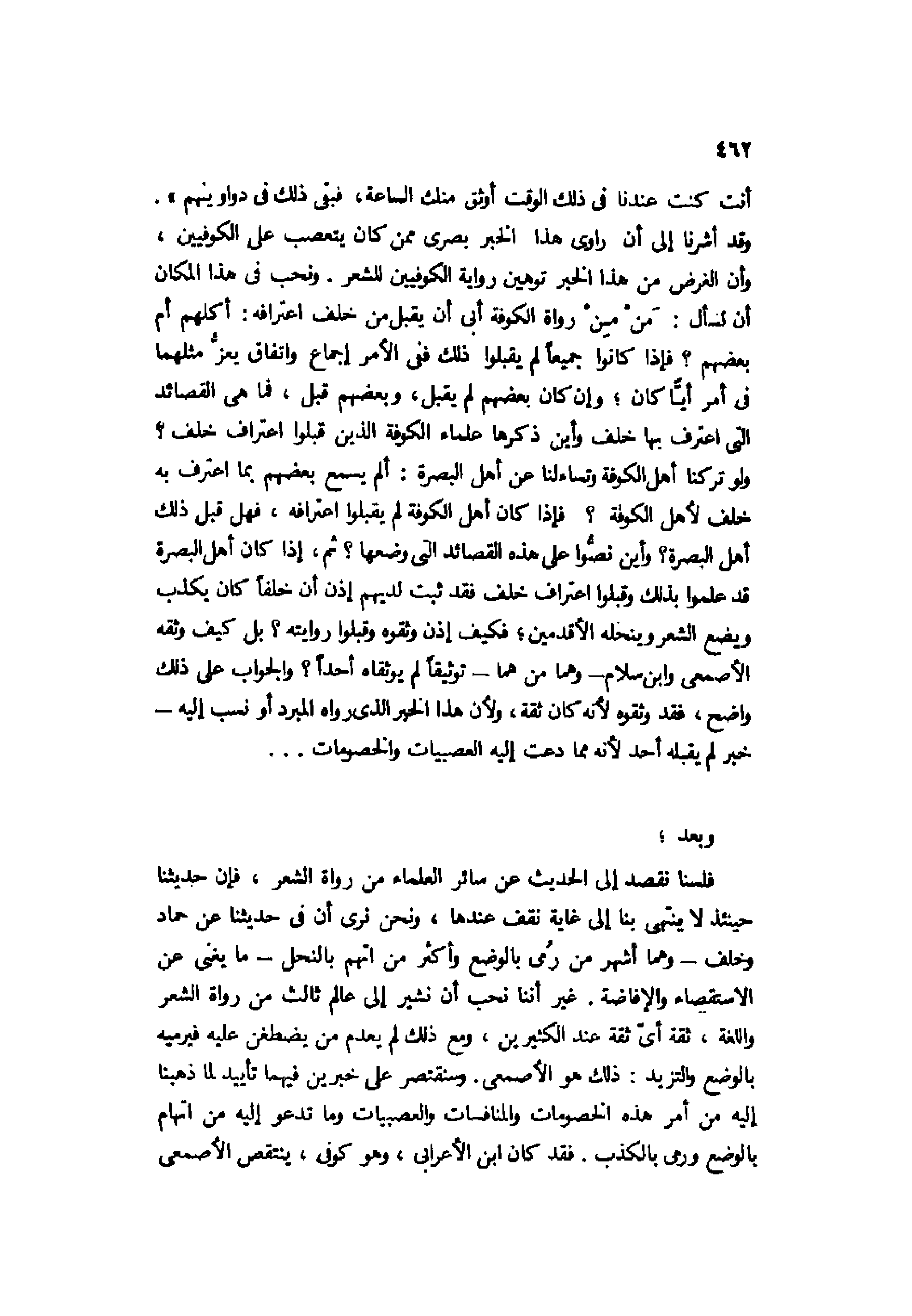وقد أشرنا إلى أن راوي هذا الخبر بصري ممن كان يتعصب على الكوفيين، وأن الغرض من هذا الخبر توهين رواية الكوفيين للشعر. ونحب في هذا المكان أن نسأل: مَنْ مِنْ رواة الكوفة أبى أن يقبل من خلف اعترافه: أكلهم أم بعضهم؟ فإذا كانوا جميعًا لم يقبلوا ذلك ففي الأمر إجماع واتفاق يعز مثلهما في أمر أيًّا كان؛ وإن كان بعضهم لم يقبل، وبعضهم قبل، فما هي القصائد التي اعترف بها خلف وأين ذكرها علماء الكوفة الذين قبلوا اعتراف خلف؟ ولو تركنا أهل الكوفة وتساءلنا عن أهل البصرة: ألم يسمع بعضهم بما اعترف به خلف لأهل الكوفة؟ فإذا كان أهل الكوفة لم يقبلوا اعترافه، فهل قبل ذلك أهل البصرة؟ وأين نصوا على هذه القصائد التي وضعها؟ ثم، إذا كان أهل البصرة قد علموا بذلك وقبلوا اعتراف خلف فقد ثبت لديهم إذن أن خلفًا كان يكذب ويضع الشعر وينحله الأقدمين؛ فكيف إذن وثقوه وقبلوا روايته؟ بل كيف وثقه الأصمعي وابن سلام -وهما من هما- توثيقًا لم يوثقاه أحدًا؟ والجواب على ذلك واضح، فقد وثقوه لأنه كان ثقة، ولأن هذا الخبر الذي رواه المبرد أو نسب إليه خبر لم يقبله أحد لأنه مما دعت إليه العصبيات والخصومات ...