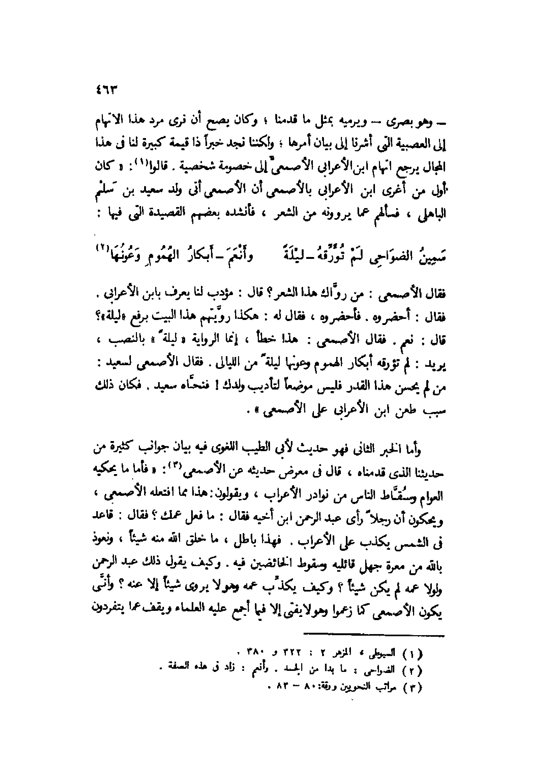 -وهو بصري- ويرميه بمثل ما قدمنا؛ وكان يصح أن نرى مرد هذا الاتهام إلى العصبية التي أشرنا إلى بيان أمرها. ولكننا نجد خبرًا ذا قيمة كبيرة لنا في هذا المجال يرجع اتهام ابن الأعرابي الأصمعي إلى خصومة شخصية. قالوا1: "كان أول من أغرى ابن الأعرابي بالأصمعي أن الأصمعي أتى ولد سعيد بن سلم الباهلي، فسألهم عما يروونه من الشعر، فأنشده بعضهم القصيدة التي فيها: