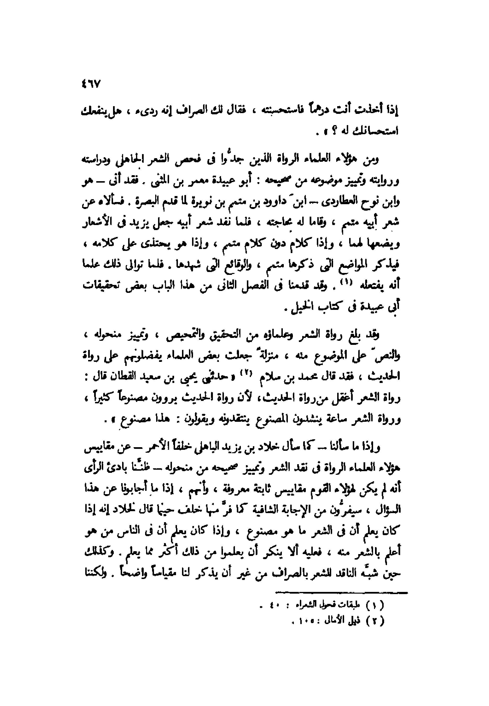 وإذا ما سألنا -كما سأل خلاد بن يزيد الباهلي خلفًا الأحمر- عن مقاييس هؤلاء العلماء الرواة في نقد الشعر وتمييز صحيحه من منحوله ظننا بادئ الرأي أنه لم يكن لهؤالاء القوم مقاييس ثابتة معروفة، وأنهم، إذا ما أجابونا عن هذا السؤال، سيفرون من الإجابة الشافية كما فر منها خلف حينما قال لخلاد إنه إذا كان يعلم أن في الشعر ما هو مصنوع، وإذا كان يعلم أن في الناس من هو أعلم بالشعر منه، فعليه ألا ينكر أن يعلموا من ذلك أكثر مما يعلم. وكذلك حين شبه الناقد للشعر بالصراف من غير أن يذكر لنا مقياسًا واضحًا. ولكننا.