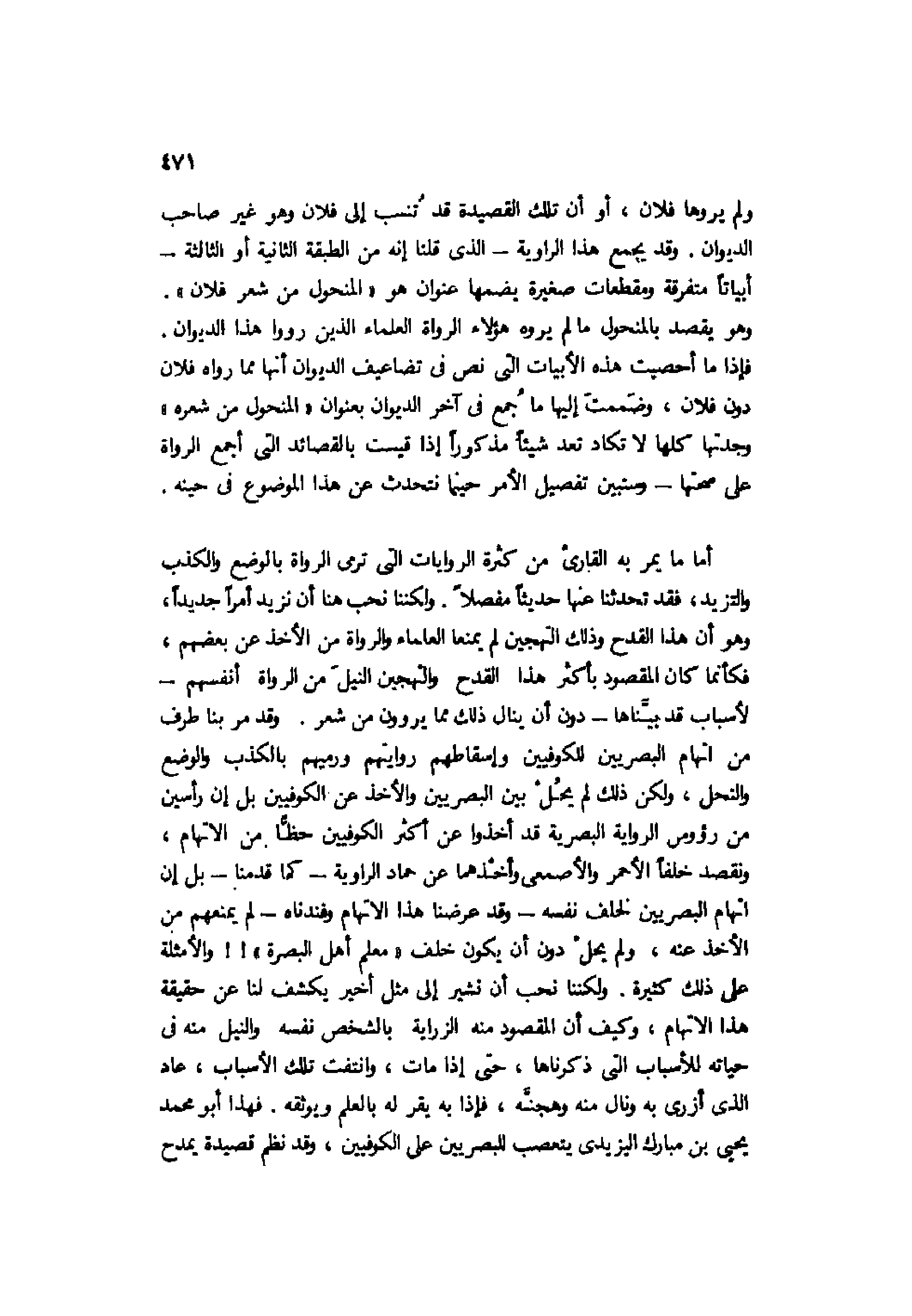 أما ما يمر به القارئ من كثرة الروايات التي ترمي الرواة بالوضع والكذب والتزيد، فقد تحدثنا عنها حديثًا مفصلًا. ولكننا نحب هنا أن نزيد أمرًا جديدًا، وهو أن هذا القدح وذلك التهجين لم يمنعا العلماء والرواة من الأخذ عن بعضهم، فكأنما كان المقصود بأكثر هذا القدح والتهجين النيل من الرواة أنفسهم -لأسباب قد بيناها- دون أن ينال ذلك مما يروون من شعر. وقد مر بنا طرف من اتهام البصريين للكوفيين وإسقاطهم روايتهم ورميهم بالكذب والوضع والنحل، ولكن ذلك لم يحل بين البصريين والأخذ عن الكوفيين بل إن رأسين من رءوس الرواية البصرية قد أخذوا عن أكثر الكوفيين حظًّا من الاتهام، ونقصد خلفًا الأحمر والأصمعي وأخذهما عن حماد الراوية -كما قدمنا- بل إن اتهام البصريين لخلف نفسه -وقد عرضنا هذا الاتهام وفندناه- لم يمنعهم من الأخذ عنه، ولم يحل دون أن يكون خلف "معلم أهل البصرة"! والأمثلة على ذلك كثيرة. ولكننا نحب أن نشير إلى مثل أخير يكشف لنا عن حقيقة هذا الاتهام، وكيف أن المقصود منه الزراية بالشخص نفسه والنيل منه في حياته للأسباب التي ذكرناها، حتى إذا مات، وانتفت تلك الأسباب، عاد الذي أزرى به ونال منه وهجنه، فإذا به يقر له بالعلم ويوثقه. فهذا أبو محمد يحيى بن مبارك اليزيدي يتعصب للبصريين على الكوفيين، وقد نظم قصيدة يمدح