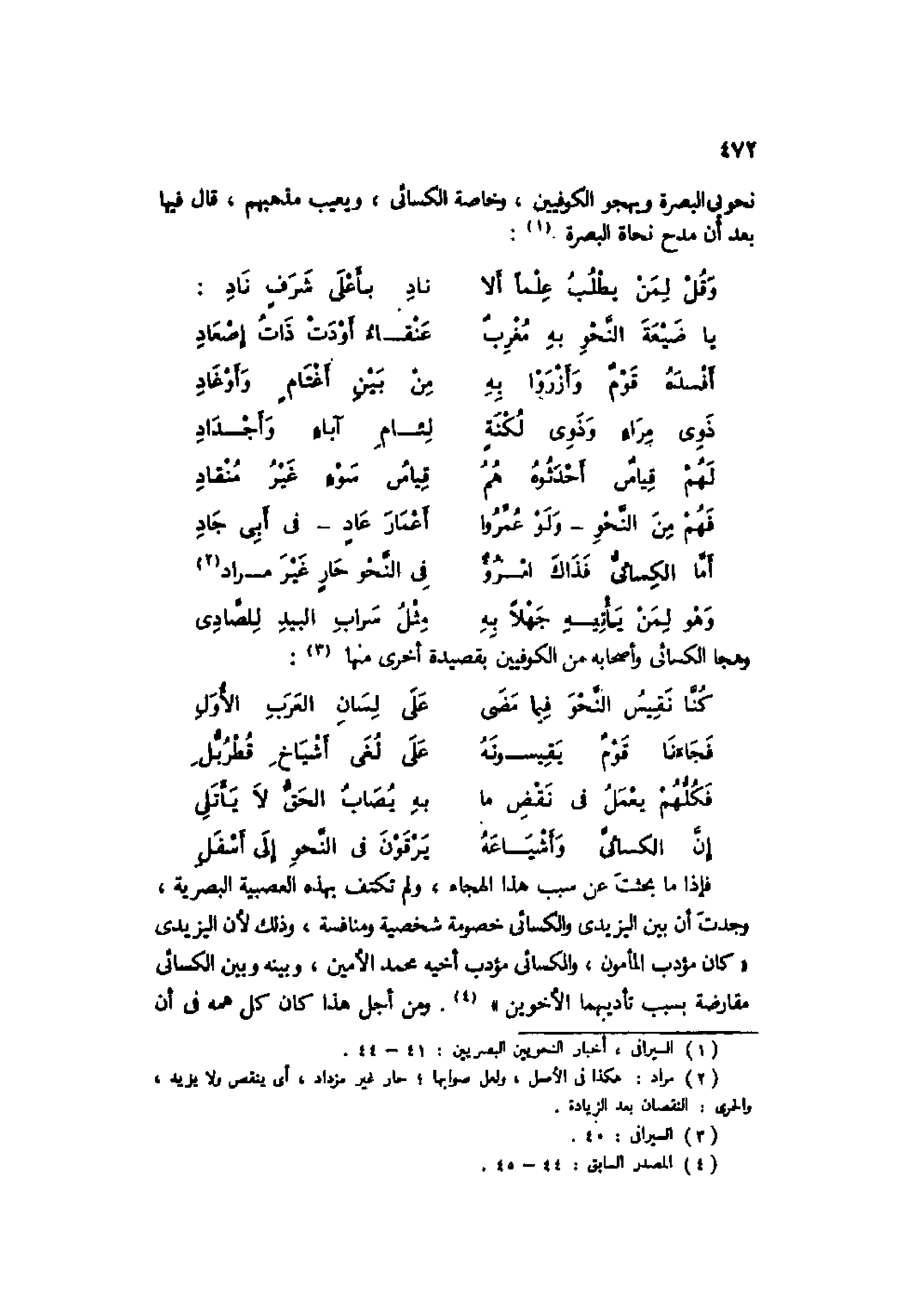 نحويي البصرة ويهجو الكوفيين، وخاصة الكسائي، ويعيب مذهبهم، قال فيها بعد أن مدح نحاة البصرة1: