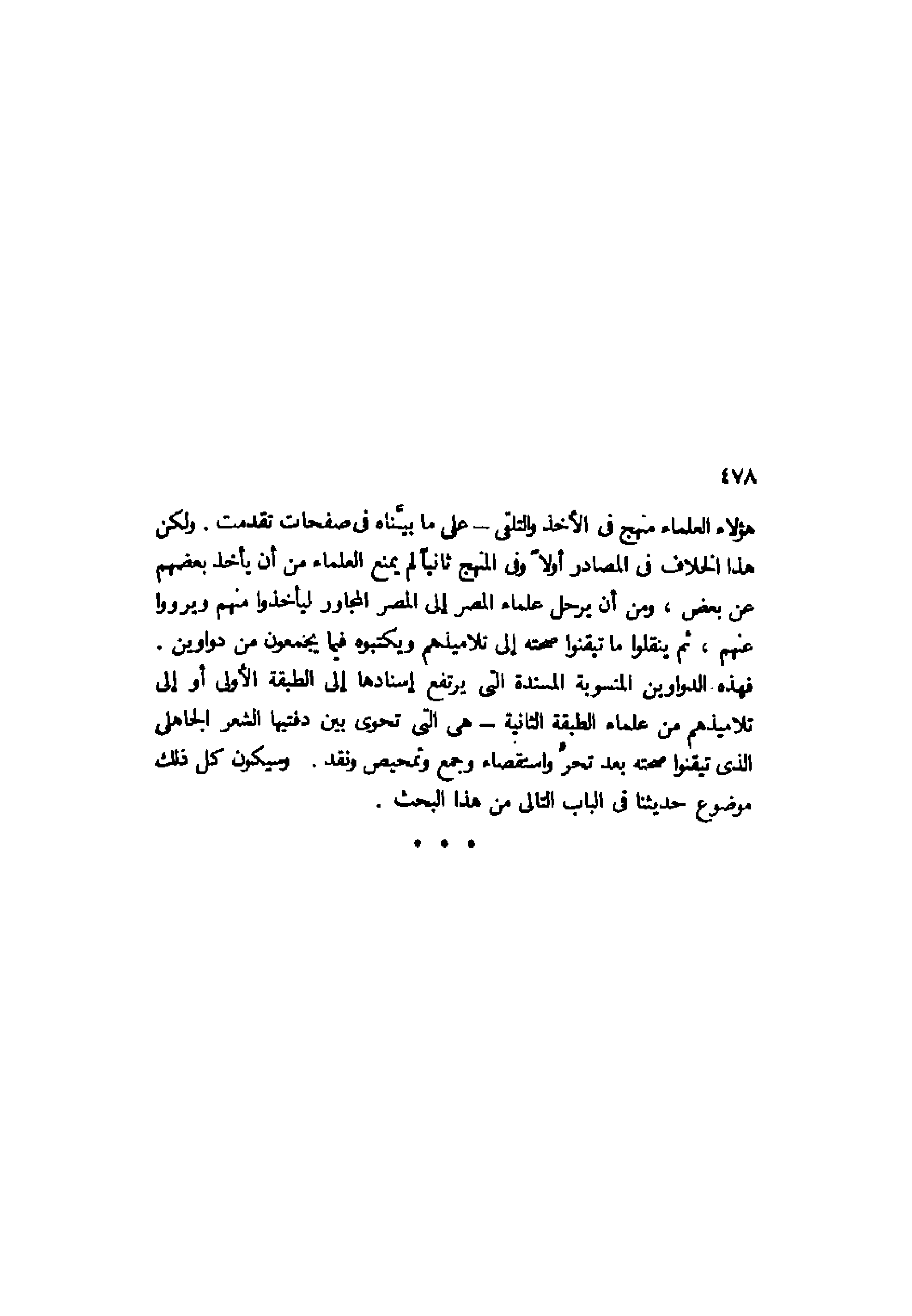 فهذه الدواوين المنسوبة المسندة التي يرتفع إسنادها إلى الطبقة الأولى أو إلى تلاميذهم من علماء الطبقة الثانية هي التي تحوي بين دفتيها الشعر الجاهلي الذي تيقنوا صحته بعد تحرٍّ واستقصاء وجمع وتمحيص ونقد. وسيكون كل ذلك موضوع حديثنا في الباب التالي من هذا البحث.
