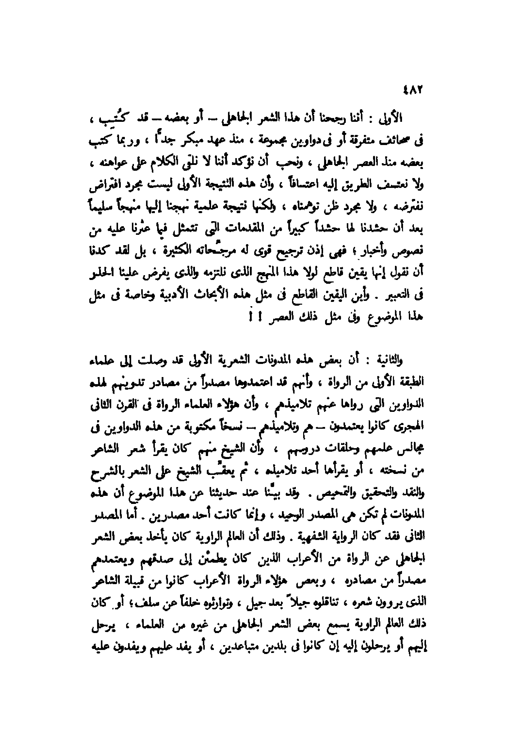 الأولى: أننا رجحنا أن هذا الشعر الجاهلي -أو بعضه- قد كُتب، في صحائف متفرقة أو في دواوين مجموعة، منذ عهد مبكر جدًّا، وربما كتب بعضه منذ العصر الجاهلي، ونحب أن نؤكد أننا لا نلقي الكلام على عواهنه، ولا نعتسف الطريق إليه اعتسافًا، وأن هذه النتيجة الأولى ليست مجرد افتراض نفترضه، ولا مجرد ظن توهمناه، ولكنها نتيجة علمية نهجنا إليها منهجًا سليمًا بعد أن حشدنا لها حشدًا كبيرًا من المقدمات التي تتمثل فيما عثرنا عليه من نصوص وأخبار؛ فهي إذن ترجيح قوي له مرجحاته الكثيرة، بل لقد كدنا أن نقول إنها يقين قاطع لولا هذا المنهج الذي نلتزمه والذي يفرض علينا الحذر في التعبير. وأين اليقين القاطع في مثل هذه الأبحاث الأدبية وخاصة في مثل هذا الموضوع وفي مثل ذلك العصر!!