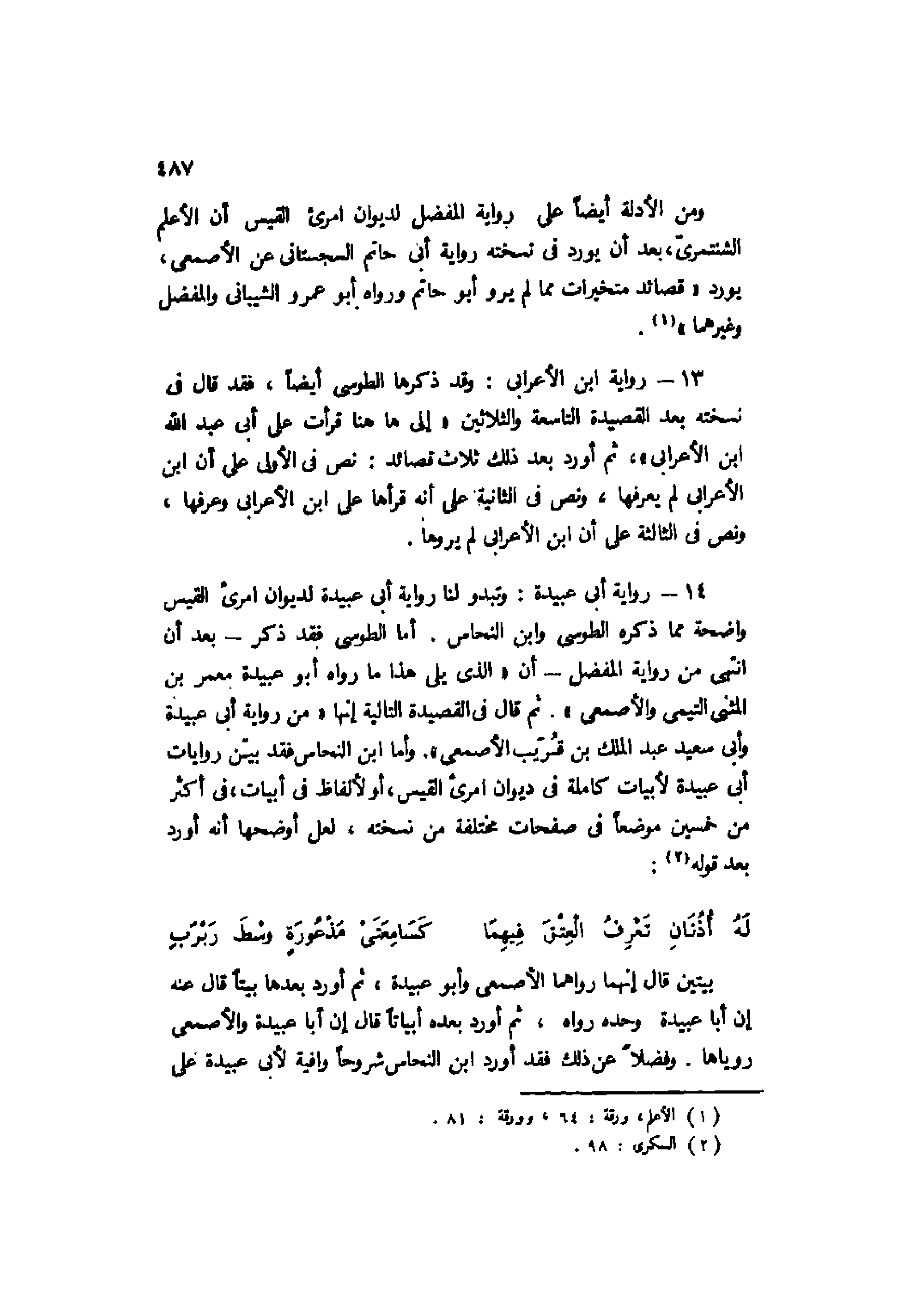 14- رواية أبي عبيدة: وتبدو لنا رواية أبي عبيدة لديوان امرئ القيس واضحة مما ذكره الطوسي وابن النحاس. أما الطوسي فقد ذكر -بعد أن انتهى من رواية المفضل- أن "الذي يلي هذا ما رواه أبو عبيدة معمر بن المثنى التيمي والأصمعي". ثم قال في القصيدة التالية إنها "من رواية أبي عبيدة وأبي سعيد عبد الملك بن قريب الأصمعي". وأما ابن النحاس فقد بين روايات أبي عبيدة لأبيات كاملة في ديوان امرئ القيس، أو لألفاظ في أبيات، في أكثر من خمسين موضعًا في صفحات مختلفة من نسخته، لعل أوضحها أنه أورد بعد قوله2: