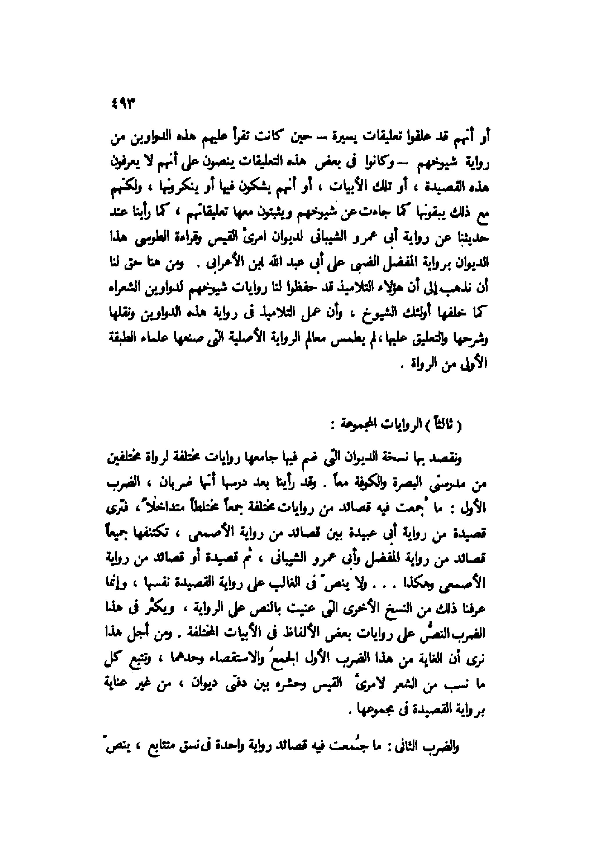 أو أنهم قد علقوا تعليقات يسيرة حين كانت تقرأ عليهم هذه الدواوين من رواية شيوخهم وكانوا في بعض هذه التعليقات ينصون على أنهم لا يعرفون هذه القصيدة، أو تلك الأبيات، أو أنهم يشكون فيها أو ينكرونها، ولكنهم مع ذلك يبقونها كما جاءت عن شيوخهم ويثبتون معها تعليقاتهم، كما رأينا عند حديثنا عن رواية أبي عمرو الشيباني لديوان امرئ القيس وقراءة الطوسي هذا الديوان برواية المفضل الضبي على أبي عبد الله بن الأعرابي. ومن هنا حق لنا أن نذهب إلى أن هؤلاء التلاميذ قد حفظوا لنا روايات شيوخهم لدواوين الشعراء كما خلفها أولئك الشيوخ، وأن عمل التلاميذ في رواية هذه الدواوين ونقلها وشرحها والتعليق عليها، لم يطمس معالم الرواية الأصلية التي صنعها علماء الطبقة الأولى من الرواة.