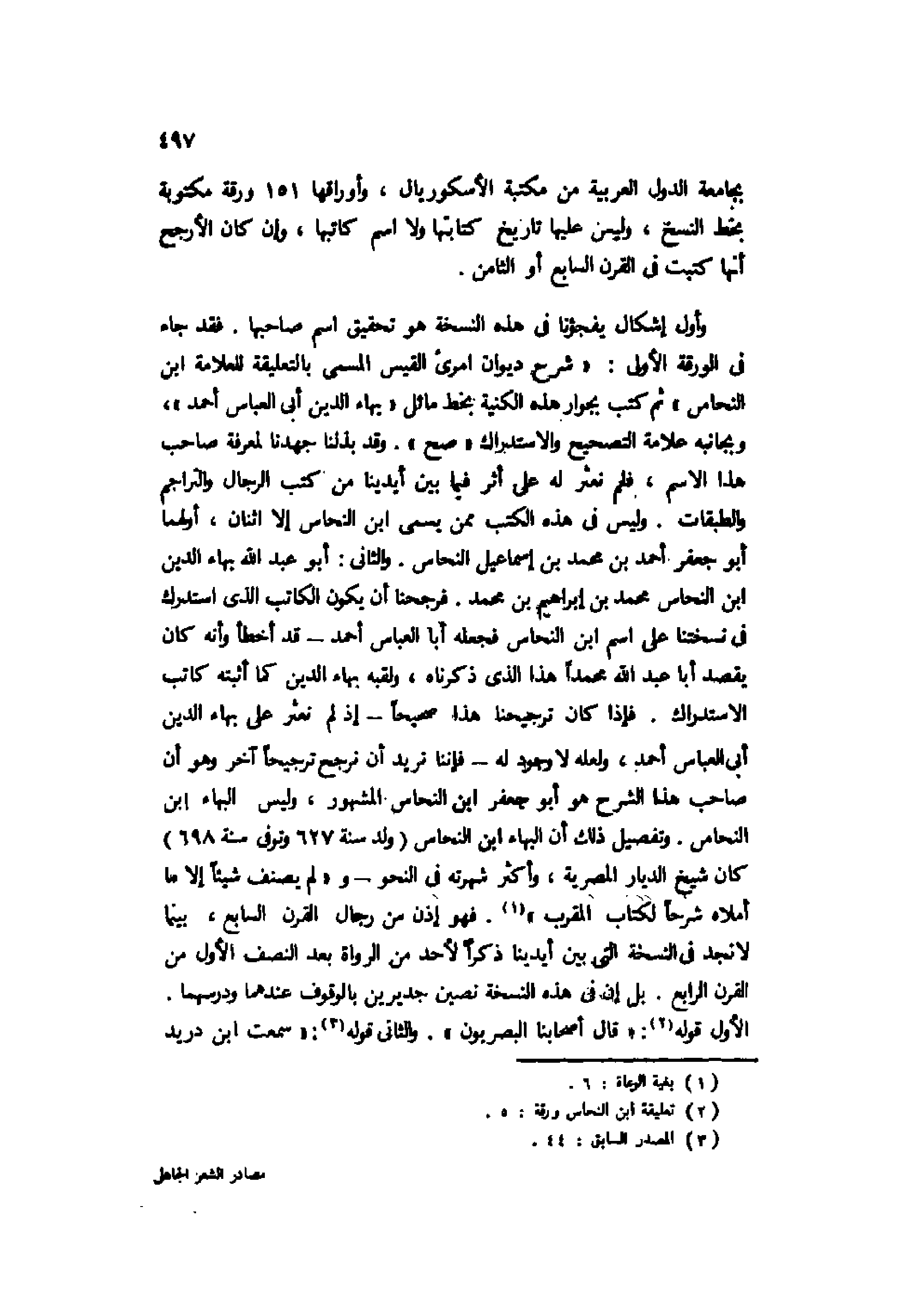 وأول إشكال يفجئونا في هذه النسخة هو تحقيق اسم صاحبها. فقد جاء في الورقة الأولى: "شرح ديوان امرئ القيس المسمى بالتعليقة للعلامة ابن النحاس" ثم كتب بجوار هذه الكنية بخط مائل "بهاء الدين أبي العباس أحمد"، وبجانبه علامة التصحيح والاستدراك "صح". وقد بذلنا جهدنا لمعرفة صاحب هذا الاسم، فلم نعثر له على أثر فيما بين أيدينا من كتب الرجال والتراجم والطبقات. وليس في هذه الكتب ممن يسمي ابن النحاس إلا اثنان، أولهما أبو جعفر أحمد بن محمد بن إسماعيل النحاس. والثاني: أبو عبد الله بهاء الدين بن النحاس محمد بن إبراهيم بن محمد. فرجحنا أن يكون الكاتب الذي استدرك في نسختنا على اسم ابن النحاس فجعله أبا العباس أحمد قد أخطأ وأنه كان يقصد أبا عبد الله محمدًا هذا الذي ذكرناه، ولقبه بهاء الدين كما أثبته كاتب الاستدراك. فإذا كان ترجيحنا هذا صحيحًا -إذ لم نعثر على بهاء الدين أبي العباس أحمد، ولعله لا وجود له- فإننا نريد أن نرجح ترجيحًا آخر وهو أن صاحب هذا الشرح هو أبو جعفر بن النحاس المشهور، وليس البهاء بن النحاس. وتفصيل ذلك أن البهاء بن النحاس "ولد سنة 627 وتوفي سنة 698" كان شيخ الديار المصرية، وأكثر شهرته في النحو و"لم يصنف شيئًا إلا ما أملاه شرحًا لكتابه المقرب"1. فهو إذن من رجال القرن السابع، بينما لا نجد في النسخة التي بين أيدينا ذكرًا لأحد من الرواة بعد النصف الأول من القرن الرابع. بل إن في هذه النسخة نصين جديرين بالوقوف عندهما ودرسهما.