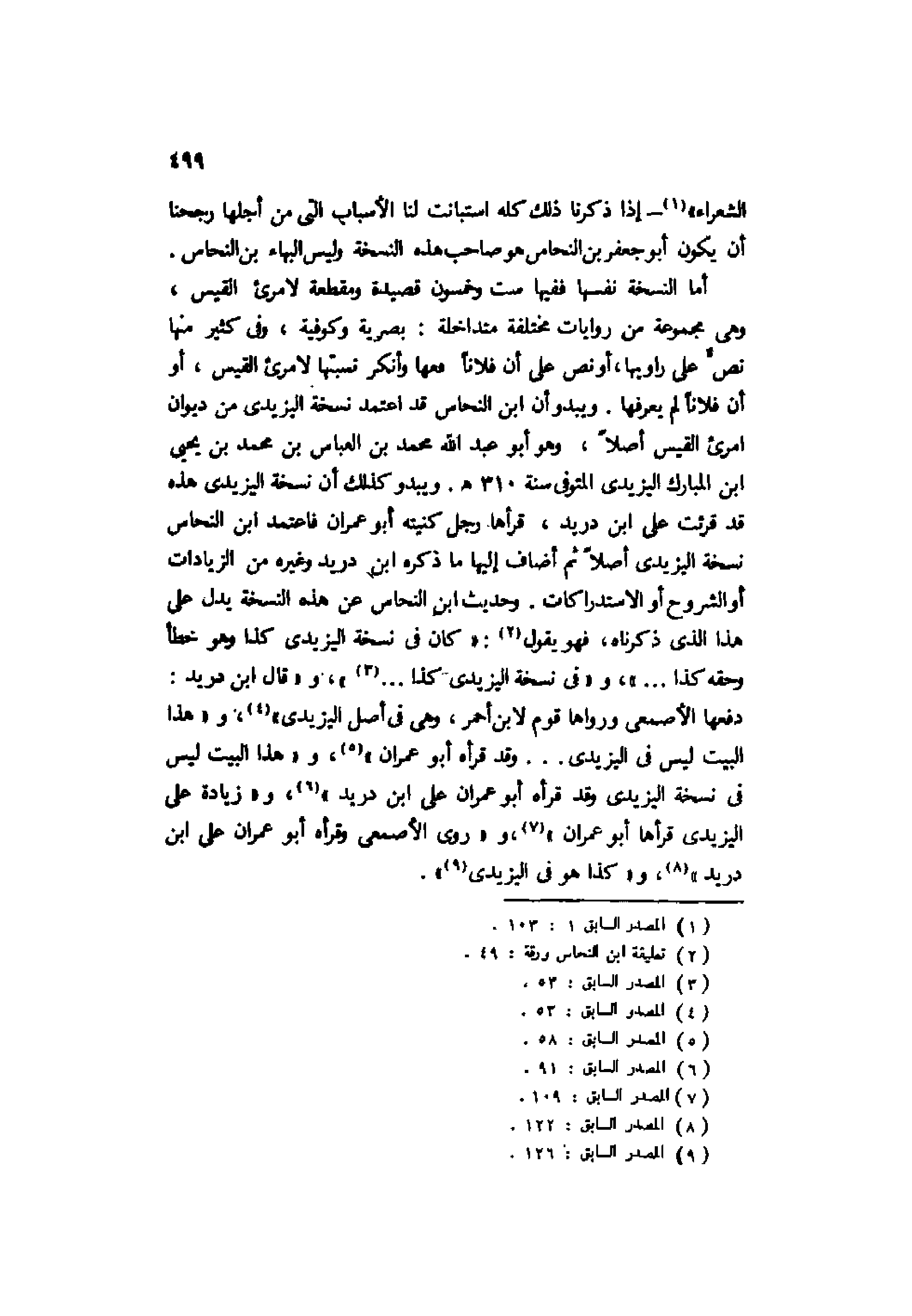 أما النسخة نفسها ففيها ست وخمسون قصيدة ومقطعة لامرئ القيس، وهي مجموعة من روايات مختلفة متداخلة: بصرية وكوفية، وفي كثير منها نص على راويها، أو نص على أن فلانًا؟؟؟ وأنكر نسبتها لامرئ القيس، أو أن فلانًا لم يعرفها. ويبدو أن ابن النحاس قد اعتمد نسخة اليزيدي من ديوان امرئ القيس أصلًا، وهو أبو عبد الله محمد بن العباس بن محمد بن يحيى بن المبارك اليزيدي المتوفى سنة 310هـ. ويبدو كذلك أن نسخة اليزيدي هذه قد قرئت على ابن دريد، قرأها رجل كنيته أبو عمران فاعتمد ابن النحاس نسخة اليزيدي أصلًا ثم أضاف إليها ما ذكره ابن دريد وغيره من الزيادات أو الشروح أو الاستدراكات. وحديث ابن النحاس عن هذه النسخة يدل على هذا الذي ذكرناه، فهو يقول2: "كان في نسخة اليزيدي كذا وهو خطأ وحقه كذا ... "، و"في نسخة اليزيدي كذا..3"، و"قال ابن دريد: دفعها الأصمعي ورواها قوم لابن أحمر، وهي في أصل اليزيدي"4، و"هذا البيت ليس في اليزيدي ... وقد قرأه أبو عمران"5، و"هذا البيت ليس في نسخة اليزيدي وقد قرأه أبو عمران على ابن دريد"6، و"زيادة على اليزيدي قرأها أبو عمران"7، و"روى الأصمعي وقرأه أبو عمران على ابن دريد"8، و "كذا هو في اليزيدي9".