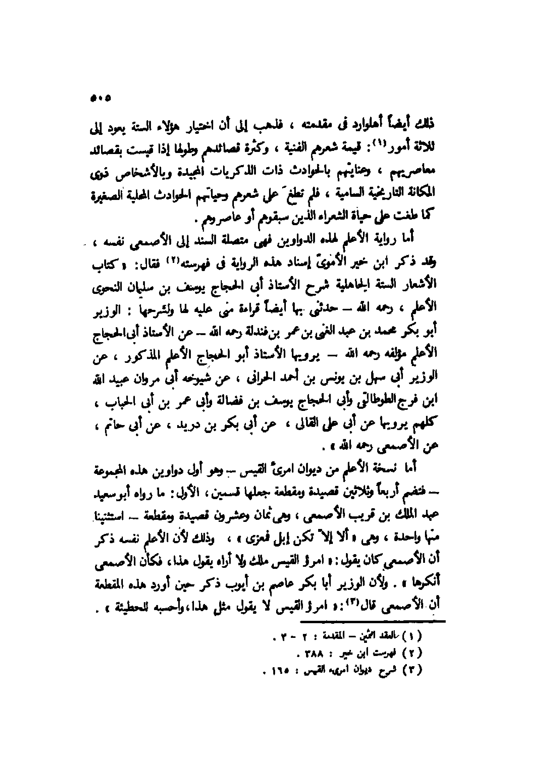 أما رواية الأعلم لهذه الدواوين فهي متصلة السند إلى الأصمعي نفسه، وقد ذكر ابن خير الأموي إسناد هذه الرواية في فهرسته2 فقال: "كتاب الأشعار الستة الجاهلية شرح الأستاذ أبي الحجاج يوسف بن سليمان النحوي الأعلم، رحمه الله حدثني بها أيضًا قراءة مني عليه لها ولشرحها: الوزير أبو بكر محمد بن عبد الغني بن عمر بن فندلة رحمه الله عن الأستاذ أبي الحجاج الأعلم مؤلفه رحمه الله يرويها الأستاذ أبو الحجاج الأعلم المذكور، عن الوزير أبي سهل بن يونس بن أحمد الحراني، عن شيوخه أبي مروان عبيد الله بن فرج الطوطالقي وأبي الحجاج يوسف بن فضالة وأبي عمر بن أبي الحباب، كلهم يرويها عن أبي علي القالي، عن أبي بكر بن دريد، عن أبي حاتم، عن الأصمعي رحمه الله.