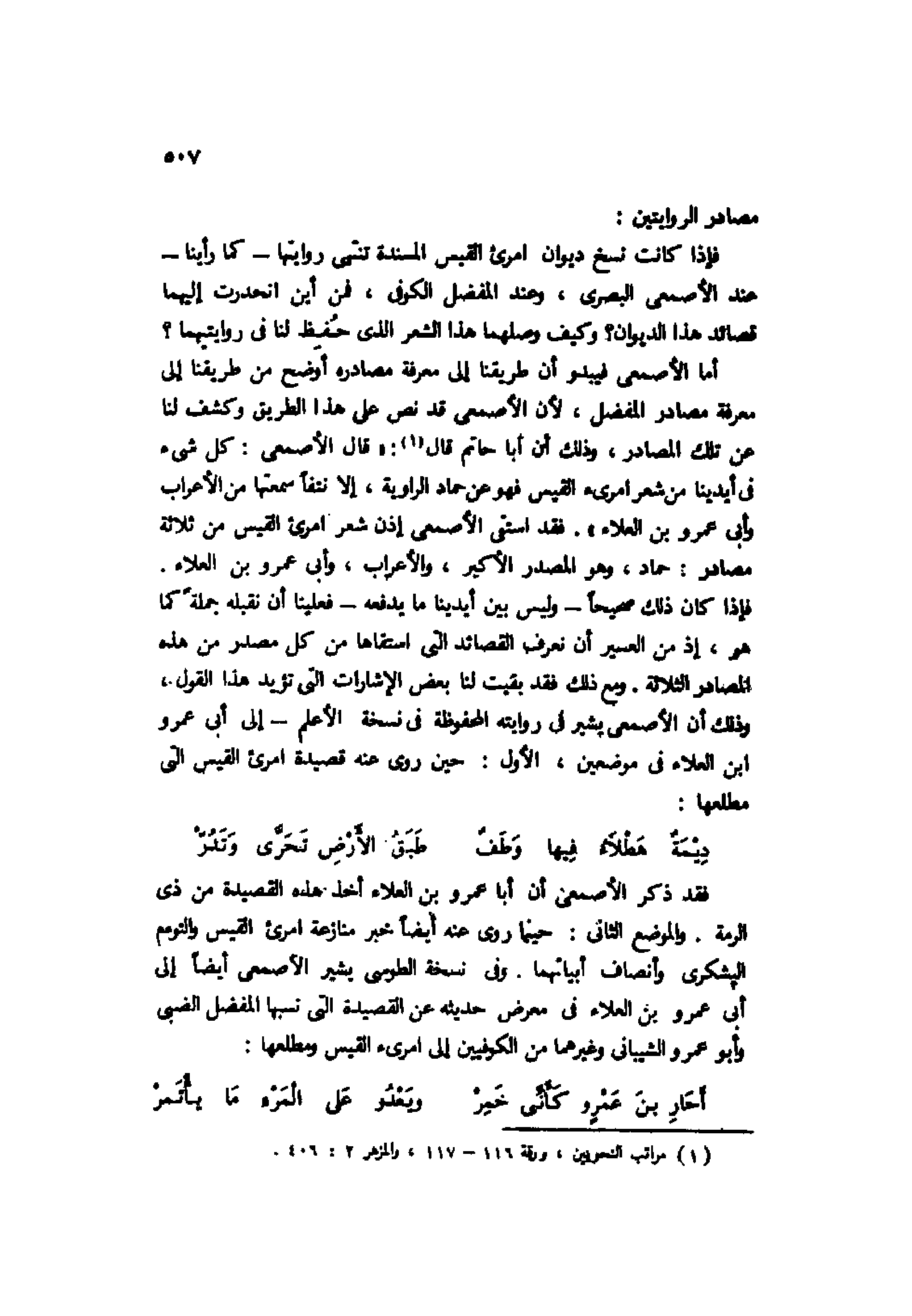 أما الأصمعي فيبدو أن طريقنا إلى معرفة مصادره أوضح من طريقنا إلى معرفة مصادر المفضل؛ لأن الأصمعي قد نص على هذا الطريق وكشف لنا عن تلك المصادر، وذلك أن أبا حاتم قال1: "قال الأصمعي: كل شيء في أيدينا من شعر امرئ القيس فهو عن حماد الراوية، إلا نتفًا سمعتها من الأعراب وأبي عمرو بن العلاء". فقد استقى الأصمعي إذن شعر امرئ القيس من ثلاثة مصادر: حماد، وهو المصدر الأكبر، والأعراب، وأبي عمرو بن العلاء.