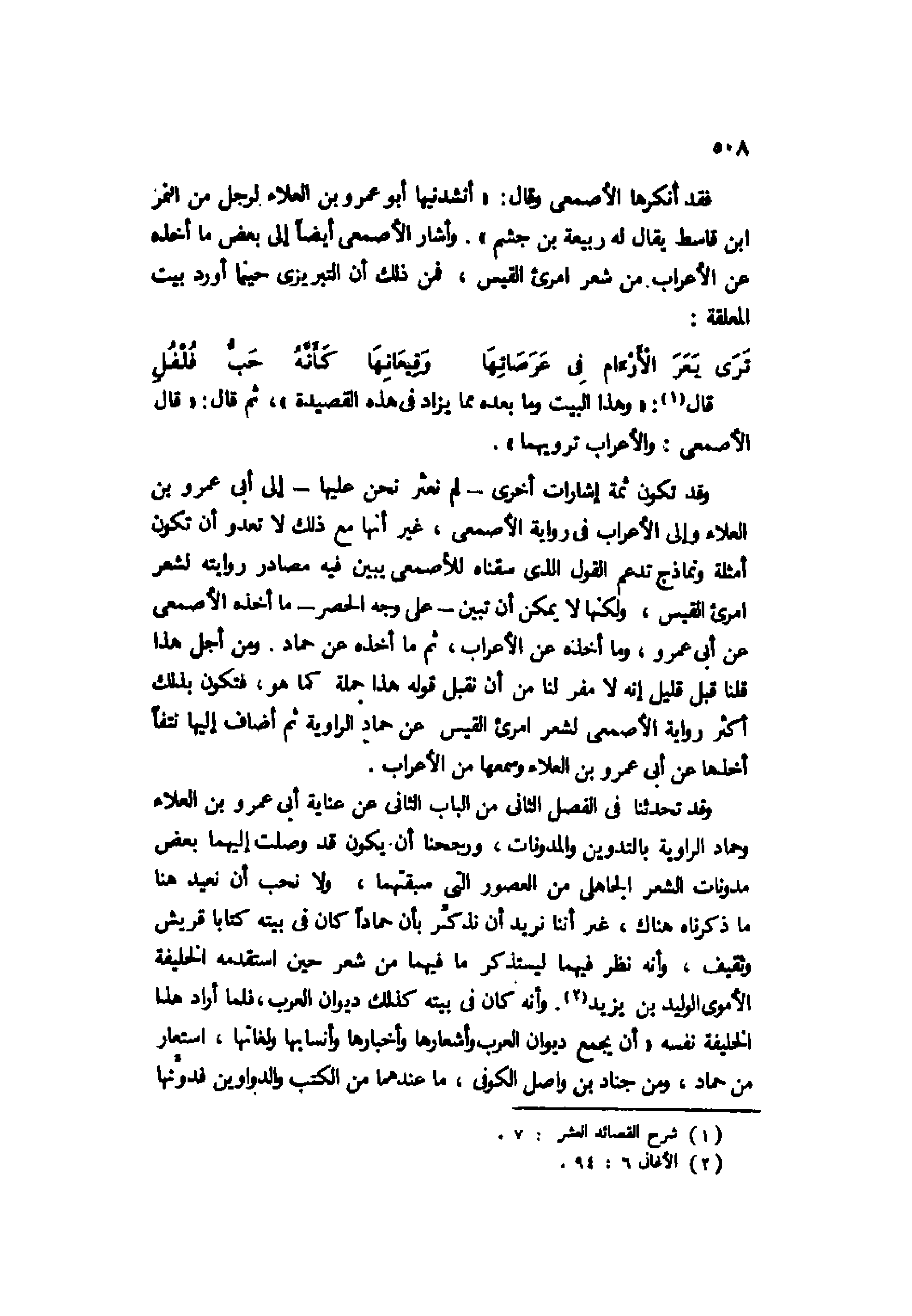 وقد تكون ثمة إشارات أخرى -لم نعثر نحن عليها- إلى أبي عمرو بن العلاء وإلى الأعراب في رواية الأصمعي، غير أنها مع ذلك لا تعدو أن تكون أمثلة ونماذج تدعم القول الذي سقناه للأصمعي يبين فيه مصادر روايته لشعر امرئ القيس، ولكنها لا يمكن أن تبين -على وجه الحصر- ما أخذه الأصمعي عن أبي عمرو، وما أخذه عن الأعراب، ثم ما أخذه عن حماد. ومن أجل هذا قلنا قبل قليل إنه لا مفر لنا من أن نقبل قوله هذا جملة كما هو، فتكون بذلك أكثر رواية الأصمعي لشعر امرئ القيس عن حماد الراوية ثم أضاف إليها نتفًا أخذها عن أبي عمرو بن العلاء وسمعها من الأعراب.
